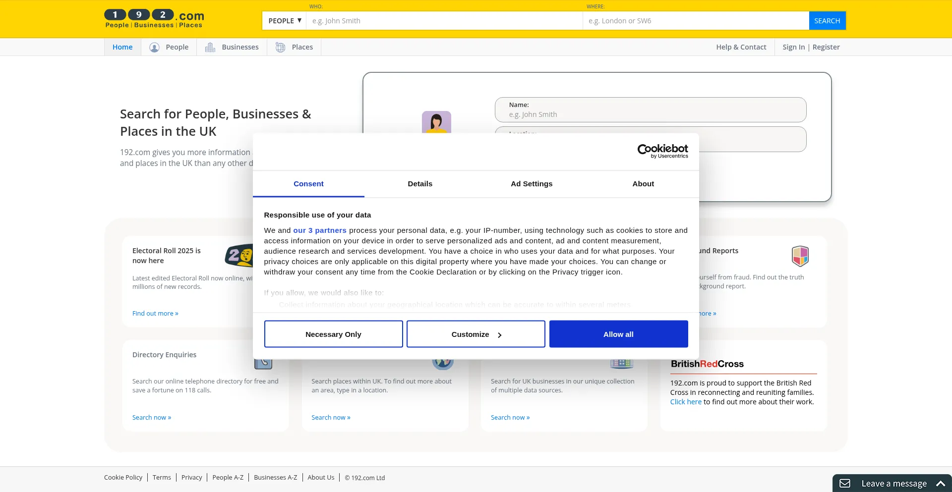 该网站实现符合GDPR或CCPA等隐私法规的cookie同意机制。这表明 192.com 遵守数据保护标准并为用户提供对个人数据收集实践的控制。