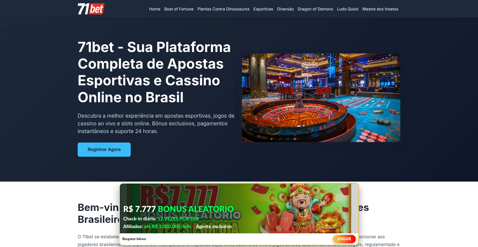 71bet oferece apostas esportivas, jogos de cassino ao vivo e slots online para jogadores brasileiros. Bônus exclusivos, pagamentos rápidos e suporte 24/7.