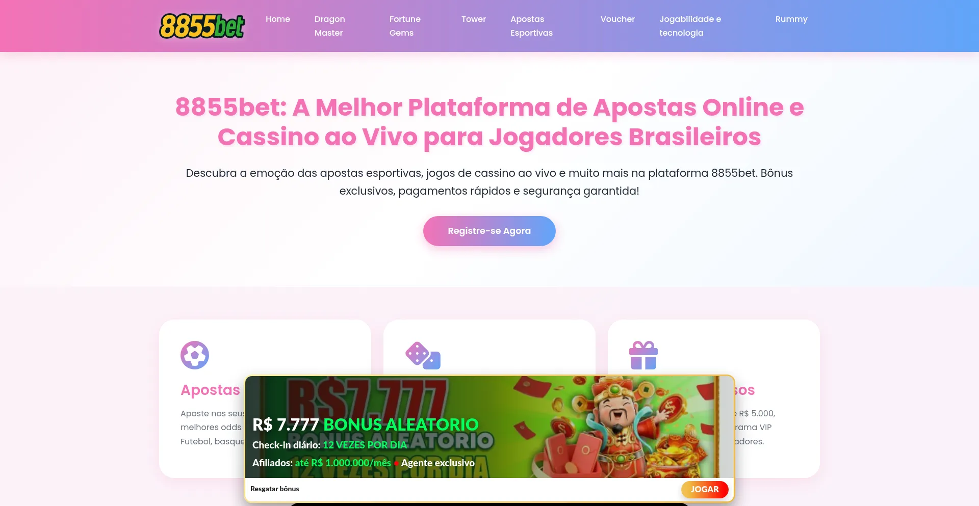8855bet é a melhor plataforma de apostas esportivas e cassino online no Brasil. Jogos ao vivo, bônus exclusivos e pagamentos rápidos. Registre-se agora!