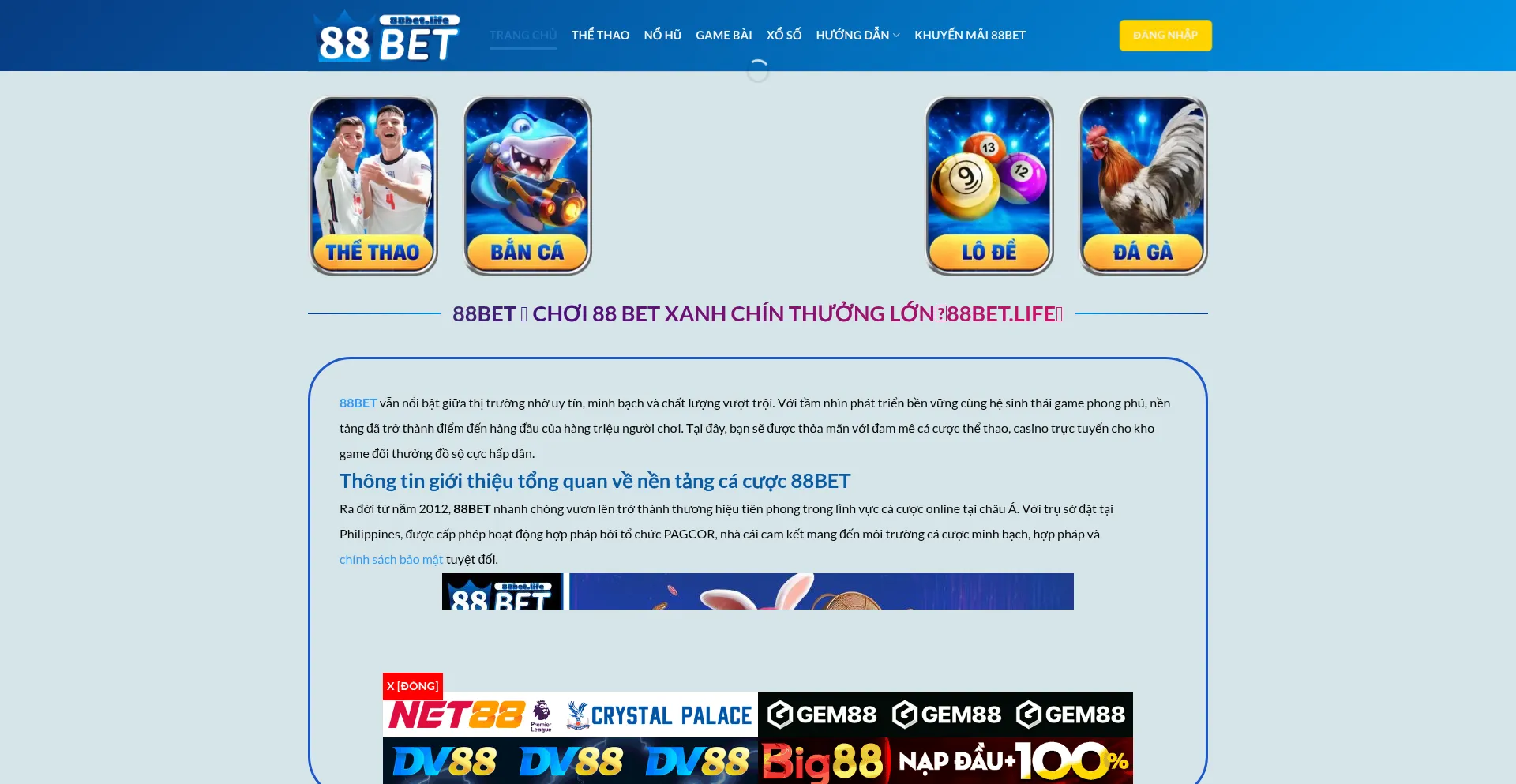 88BET - Nhà cái cá cược trực tuyến uy tín hàng đầu châu Á, mang đến trải nghiệm đẳng cấp với thể thao, casino, game bài, nổ hũ và nhiều �...