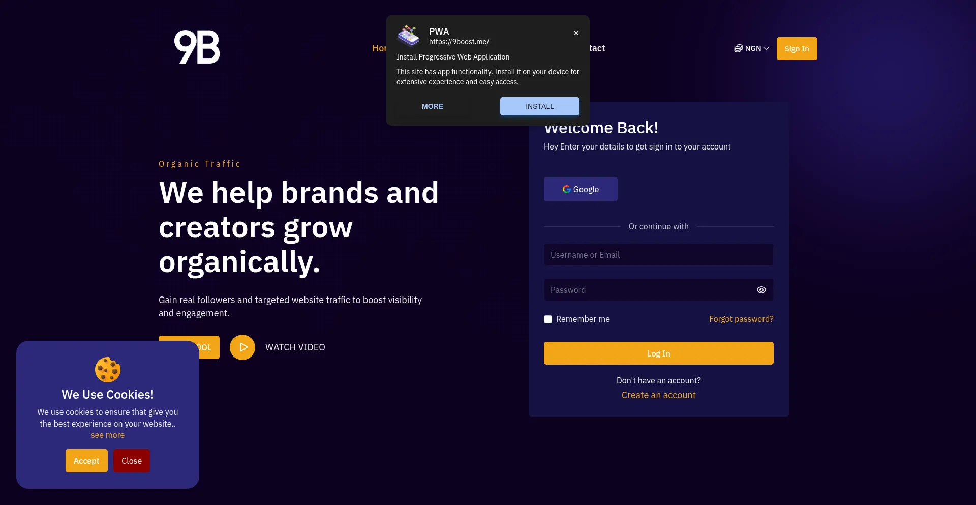 网站 9boost.me 被配置为一个带有移动应用功能的网络应用。用户可以直接将该网站安装到设备的桌面上,以快速访问并享受类似移动应用的体验。