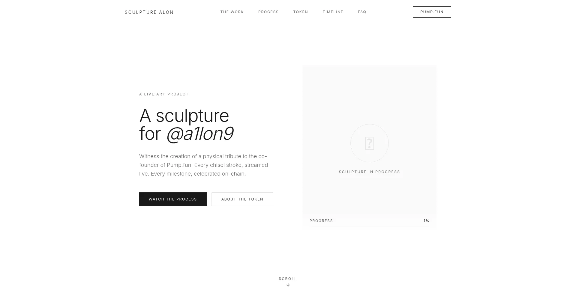 A live sculpture tribute to @a1lon9, co-founder of Pump.fun. Watch the creation process, streamed live.