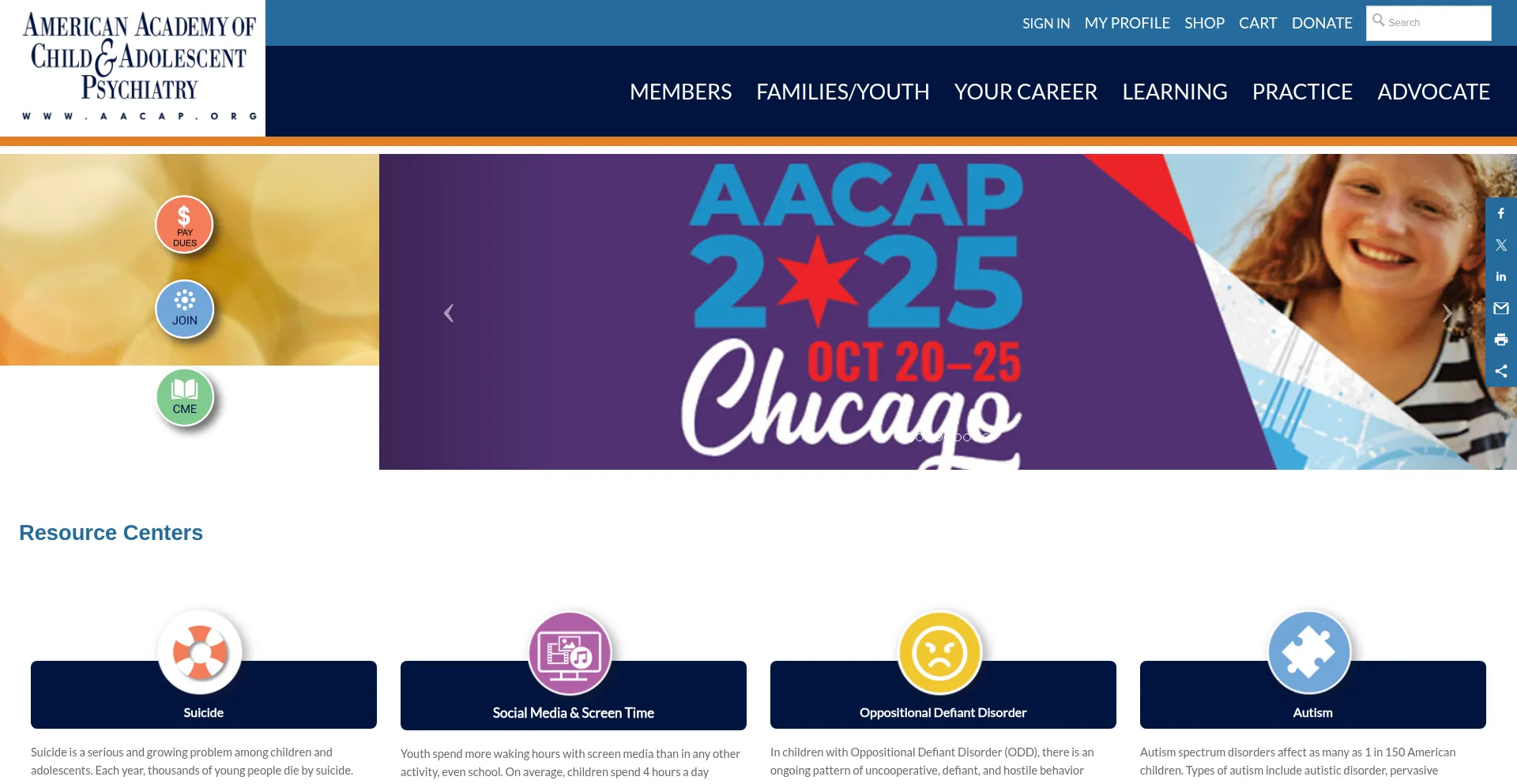 网站上存在社交媒体链接表明 aacap.org 在社交媒体上维护官方账户,这是可信度和参与度的积极信号。