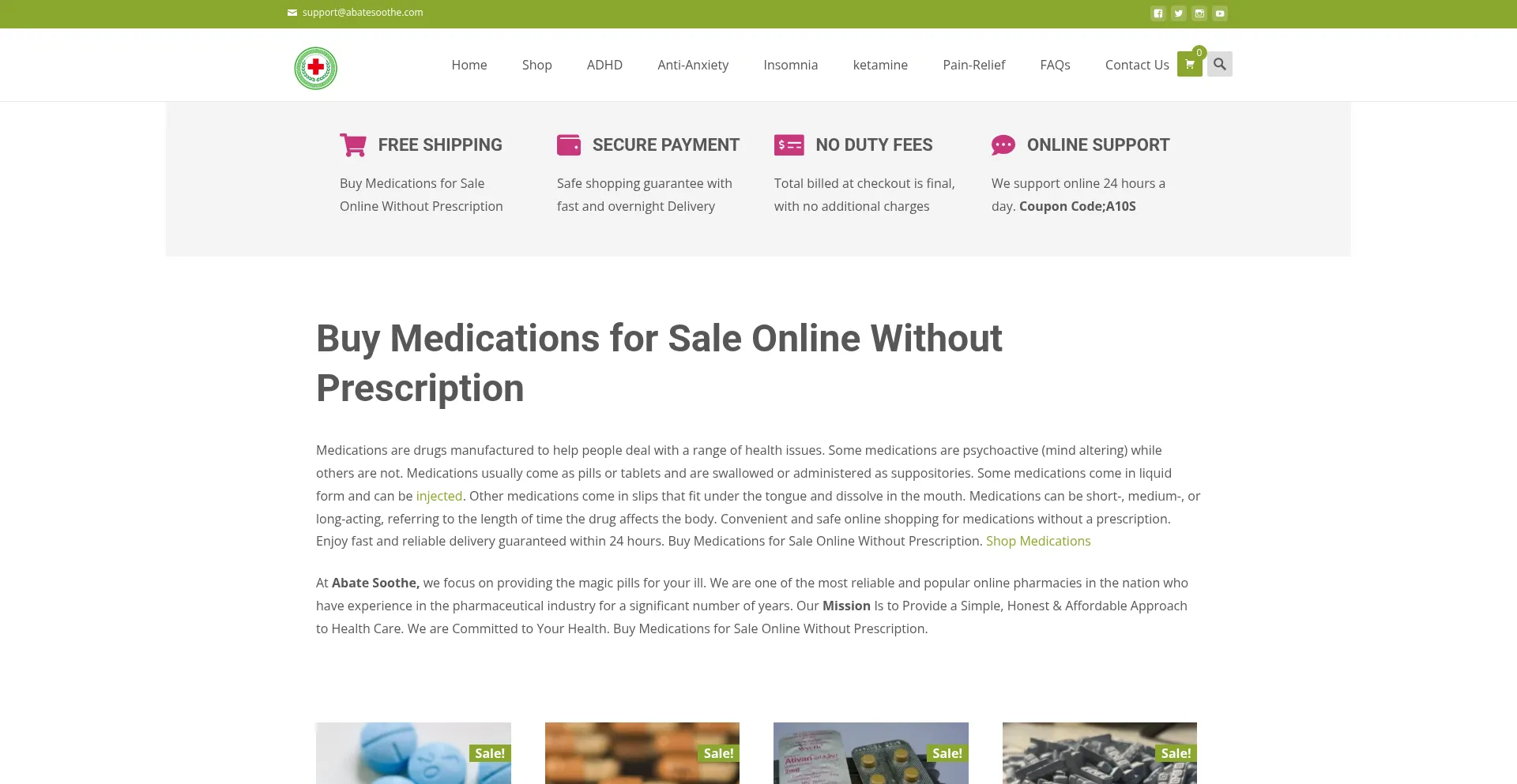Buy medications for sale online without a prescription and enjoy fast and guaranteed delivery within 24 hours. Shop now at Abate Soothe.