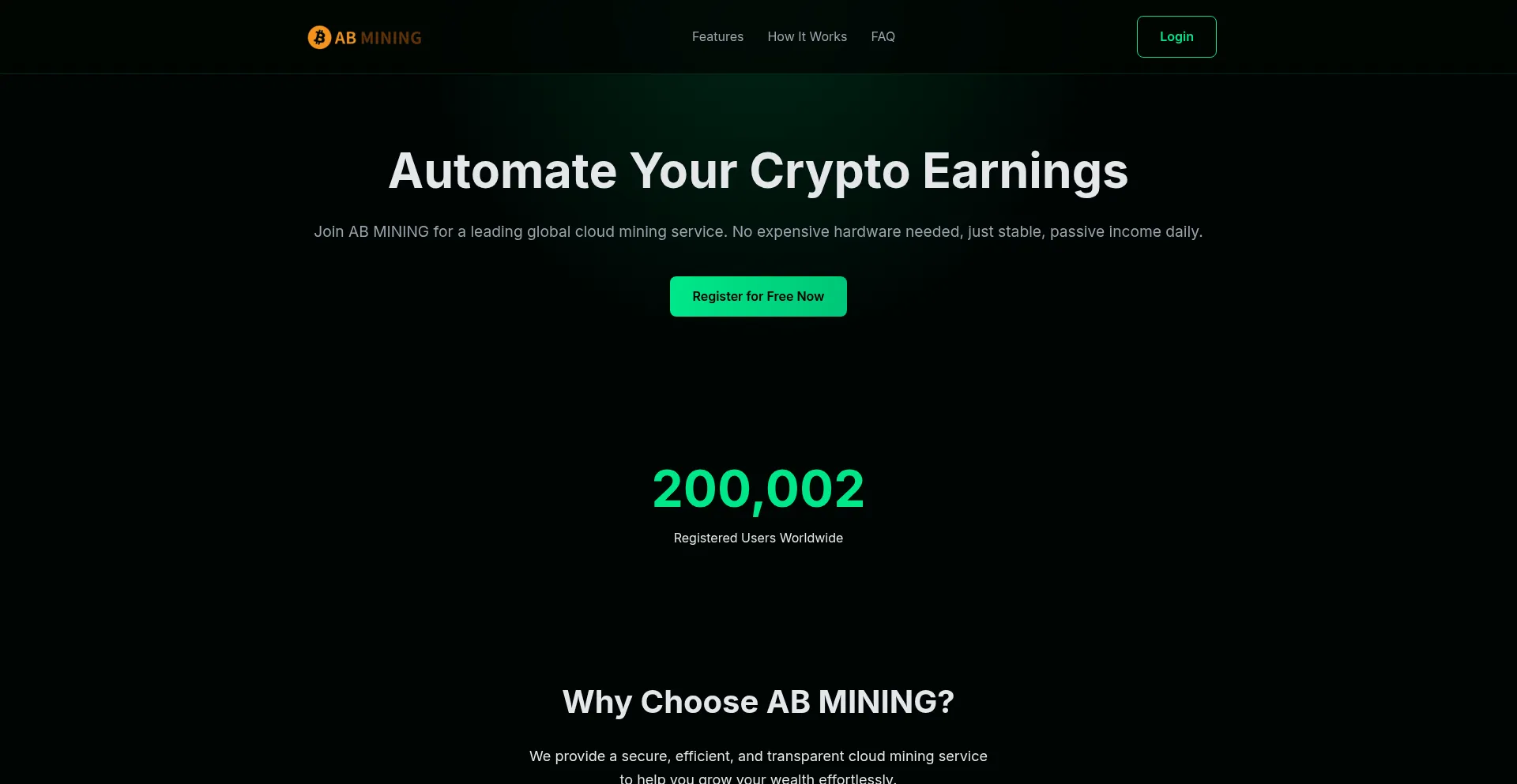网站 abmining.top 可能提供云挖矿服务或加密货币挖矿投资。一些平台提供合法的挖矿租赁服务,而其他平台可能使用虚假的挖矿仪表板来显示无法提取的虚拟收益。