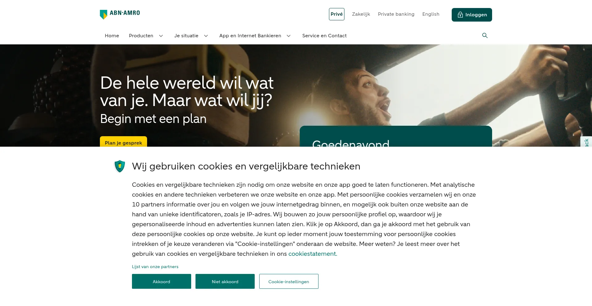 该网站实现符合GDPR或CCPA等隐私法规的cookie同意机制。这表明 abnamro.nl 遵守数据保护标准并为用户提供对个人数据收集实践的控制。