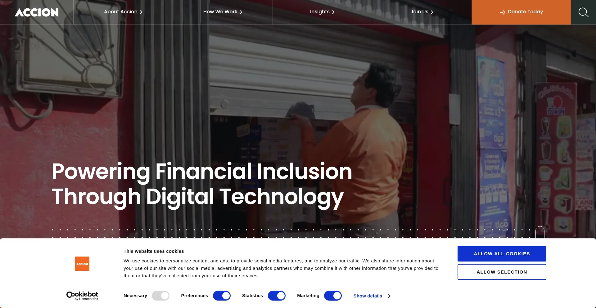 该网站实现符合GDPR或CCPA等隐私法规的cookie同意机制。这表明 accion.org 遵守数据保护标准并为用户提供对个人数据收集实践的控制。