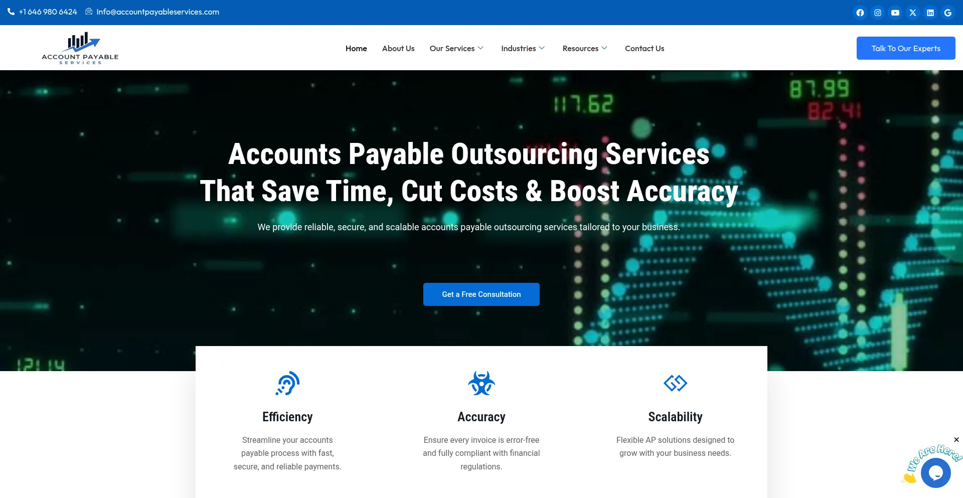 网站上存在社交媒体链接表明 accountpayableservices.com 在社交媒体上维护官方账户,这是可信度和参与度的积极信号。