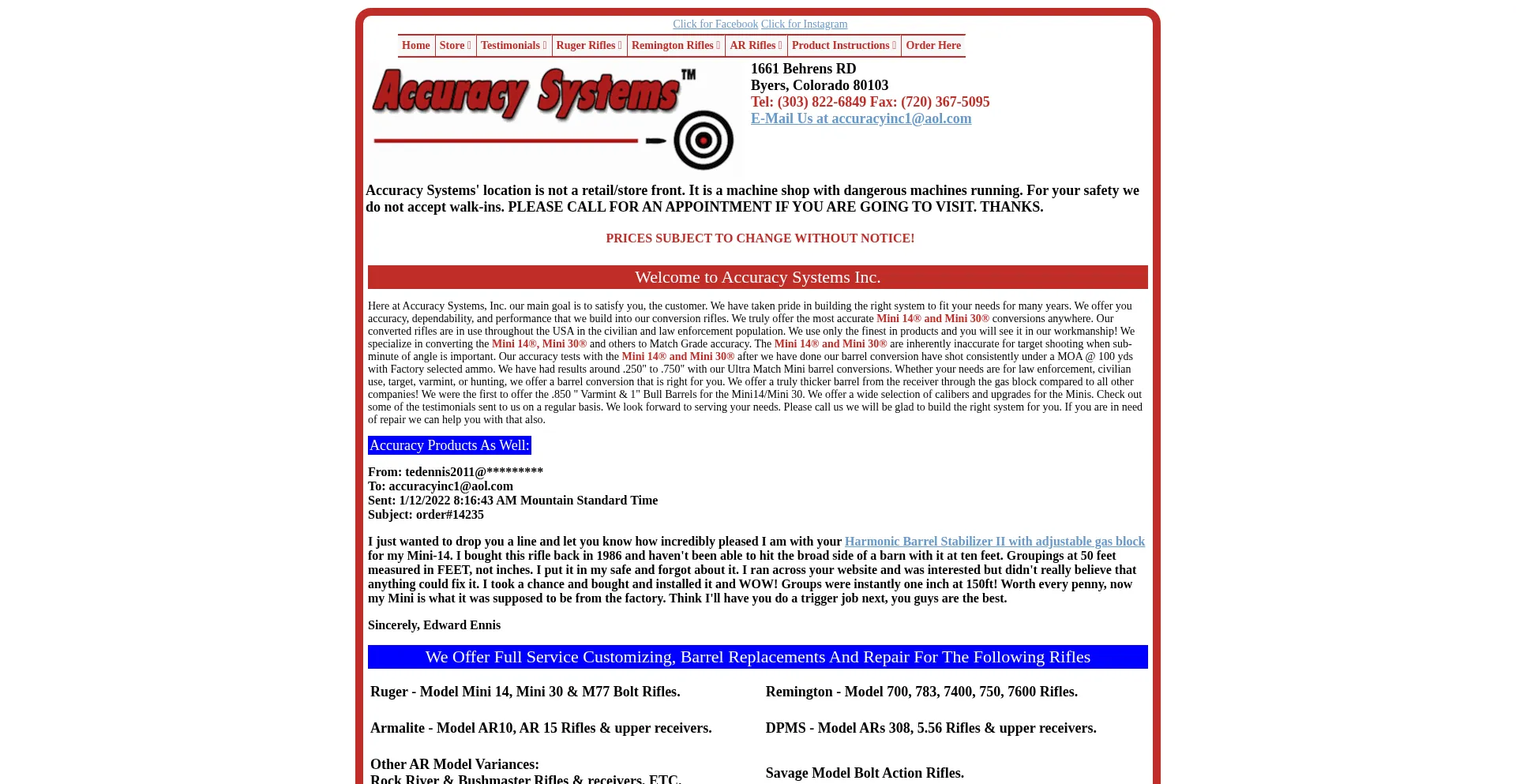 Accuracy Systems Inc does custom gunsmithing. Accuracy Systems builds custom accurate rifles and does rebarreling on AR15, AR 10, Ruger Mini 14, Mini 30, AK Variances, Remington...