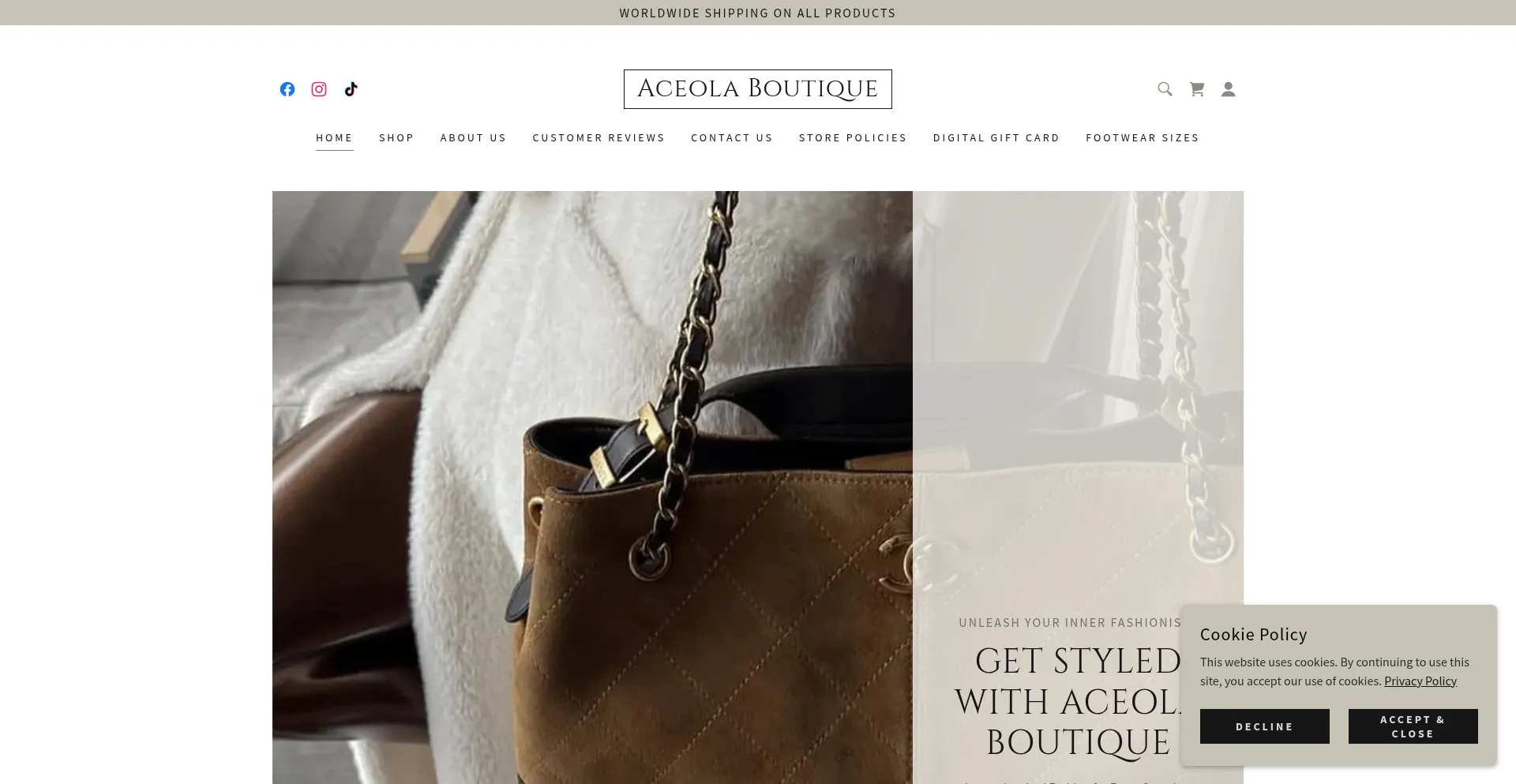 网站上存在社交媒体链接表明 aceolaboutique.com 在社交媒体上维护官方账户,这是可信度和参与度的积极信号。