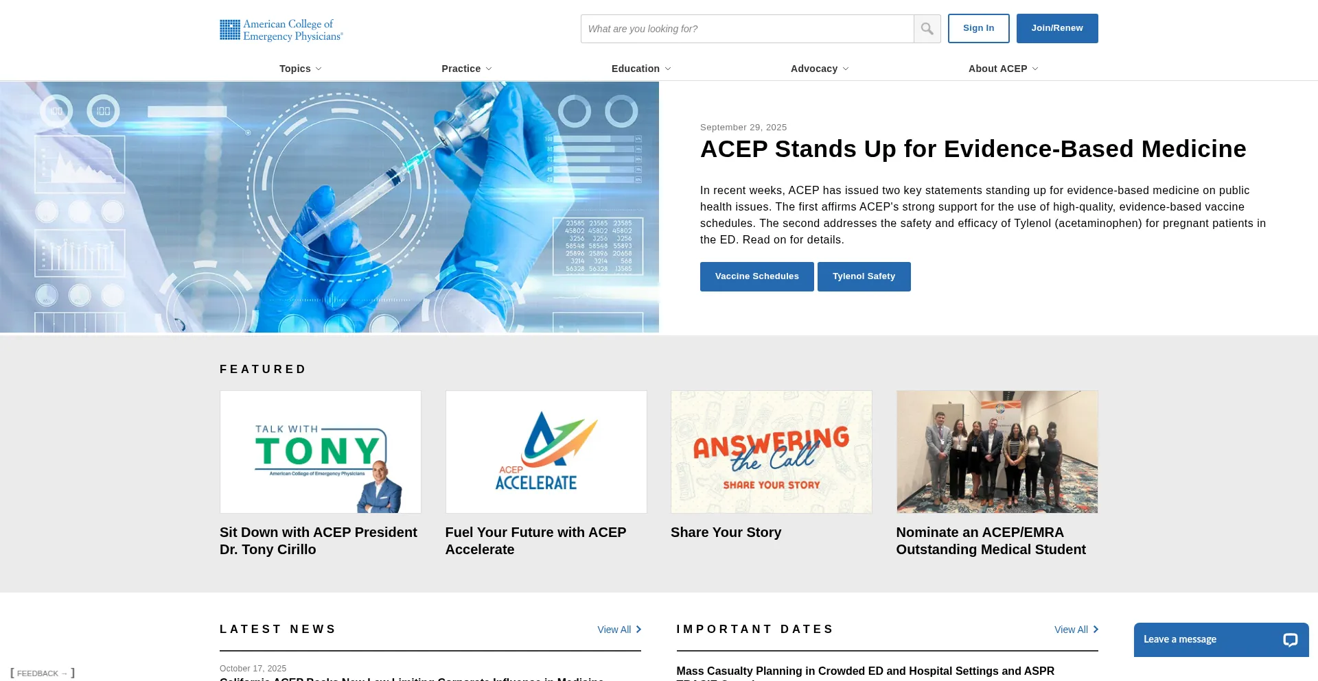 网站上存在社交媒体链接表明 acep.org 在社交媒体上维护官方账户,这是可信度和参与度的积极信号。