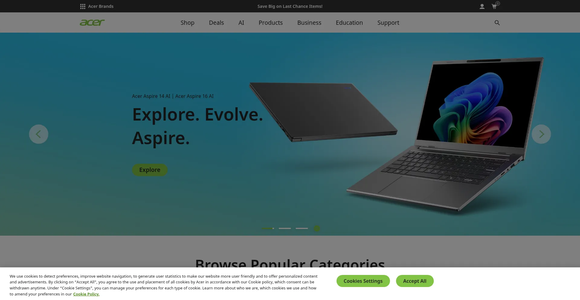 该网站实现符合GDPR或CCPA等隐私法规的cookie同意机制。这表明 acer.com 遵守数据保护标准并为用户提供对个人数据收集实践的控制。