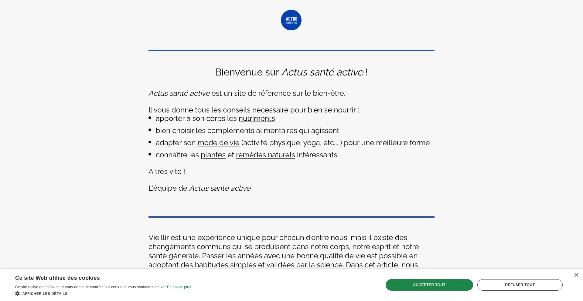 该网站实现符合GDPR或CCPA等隐私法规的cookie同意机制。这表明 actus-sante-active.com 遵守数据保护标准并为用户提供对个人数据收集实践的控制。