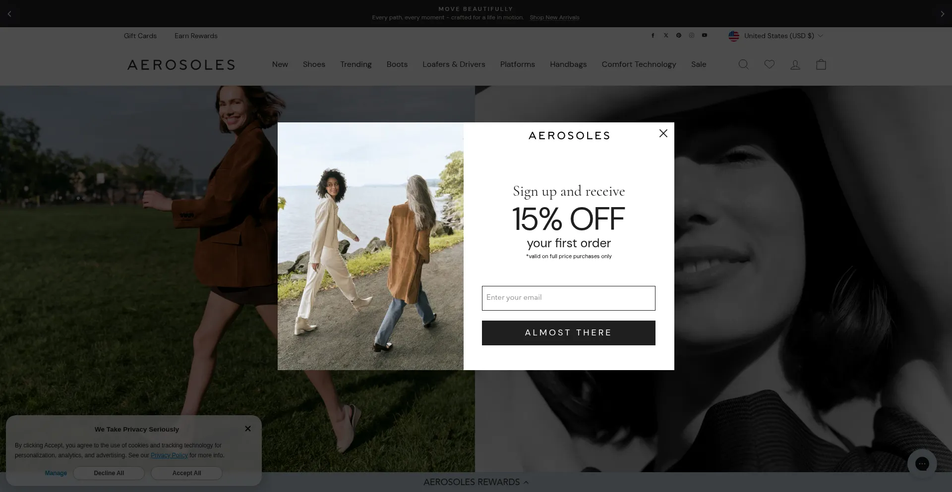 该网站实现数据收集表单,请求个人信息,包括姓名、电子邮件地址、电话号码或其他敏感详细信息。用户应验证 aerosoles.com 的合法性并在提交个人数据前查看隐私政策。