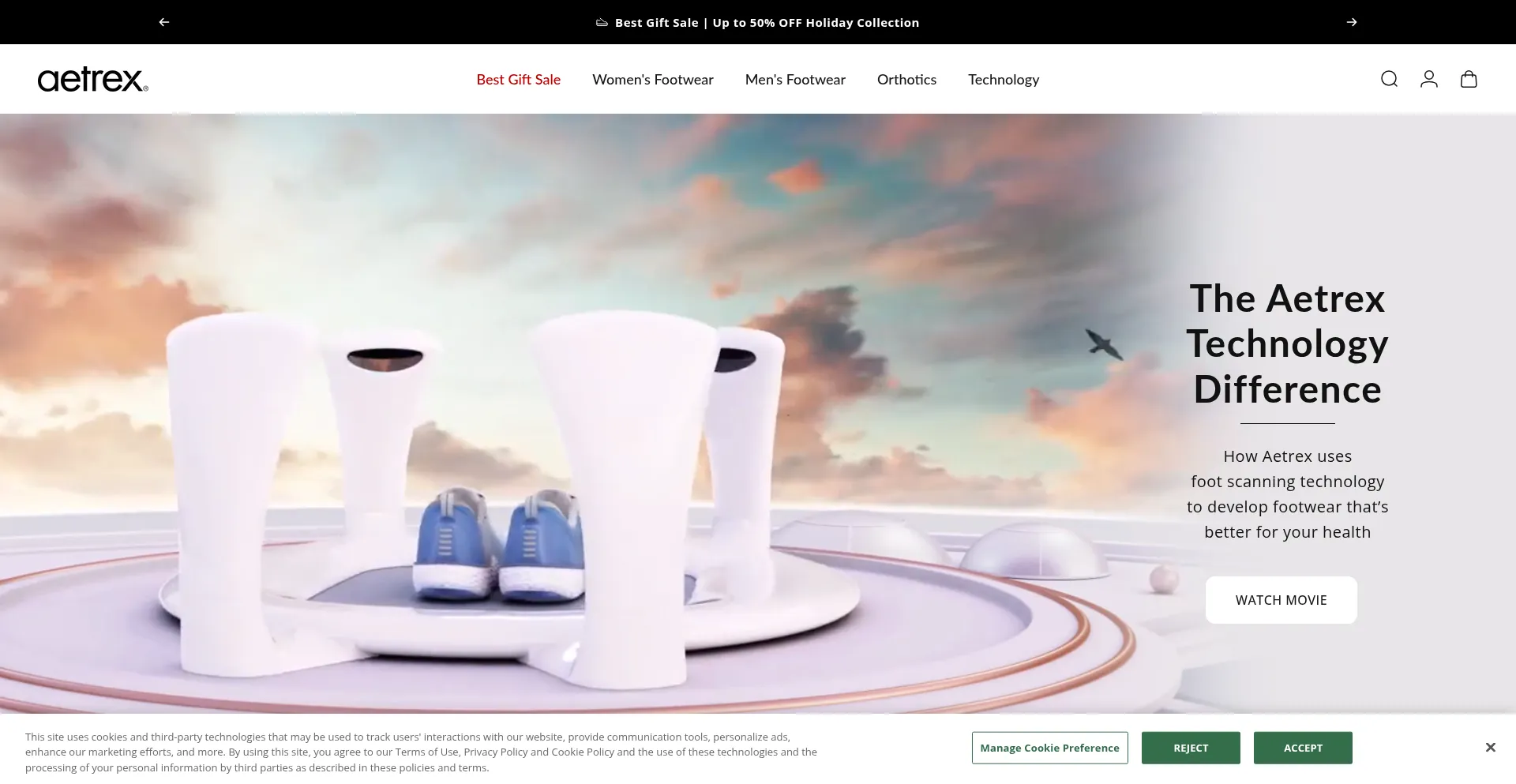 该网站实现符合GDPR或CCPA等隐私法规的cookie同意机制。这表明 aetrex.com 遵守数据保护标准并为用户提供对个人数据收集实践的控制。