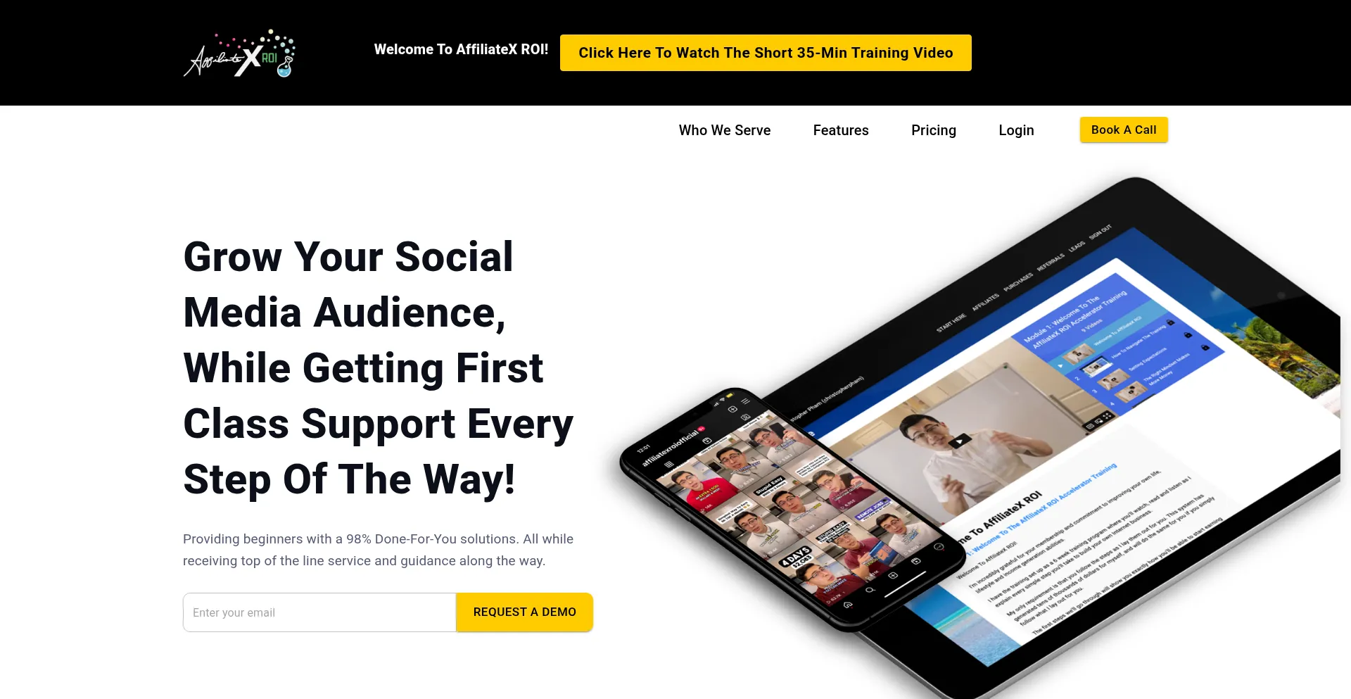 该网站实现数据收集表单,请求个人信息,包括姓名、电子邮件地址、电话号码或其他敏感详细信息。用户应验证 affiliatexroi.com 的合法性并在提交个人数据前查看隐私政策。