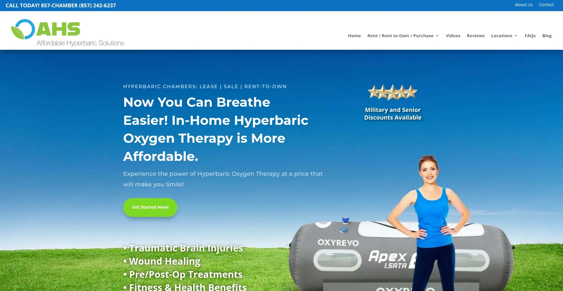 To lease, buy or rent to own hyperbaric chambers and oxygen concentrators, call AHS in Longmont, CO at (857) CHAMBER or (857) 242-6237
