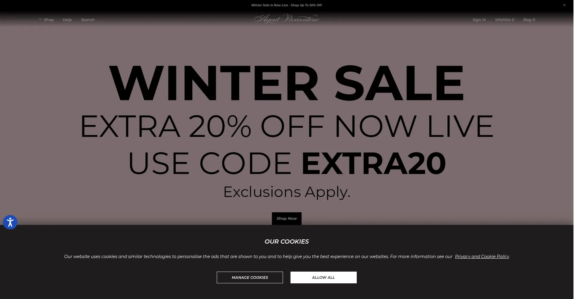 该网站实现符合GDPR或CCPA等隐私法规的cookie同意机制。这表明 agentprovocateur.com 遵守数据保护标准并为用户提供对个人数据收集实践的控制。