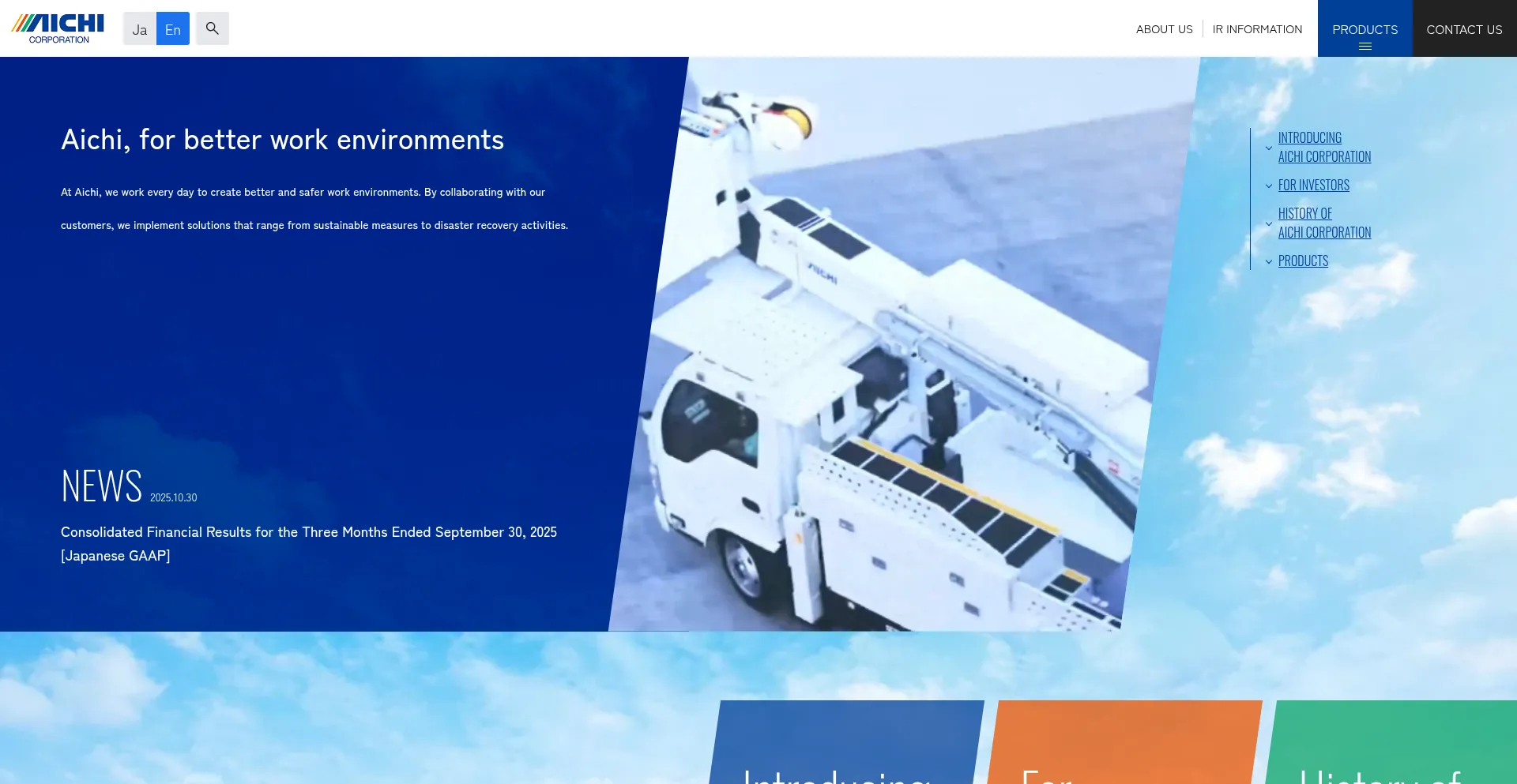 Home | Aichi Corporation Official Website Aichi Corporation — achieving "work environment creation" by mechanized vehicles, such as aerial vehicles and digger derricks / pole setters, etc.