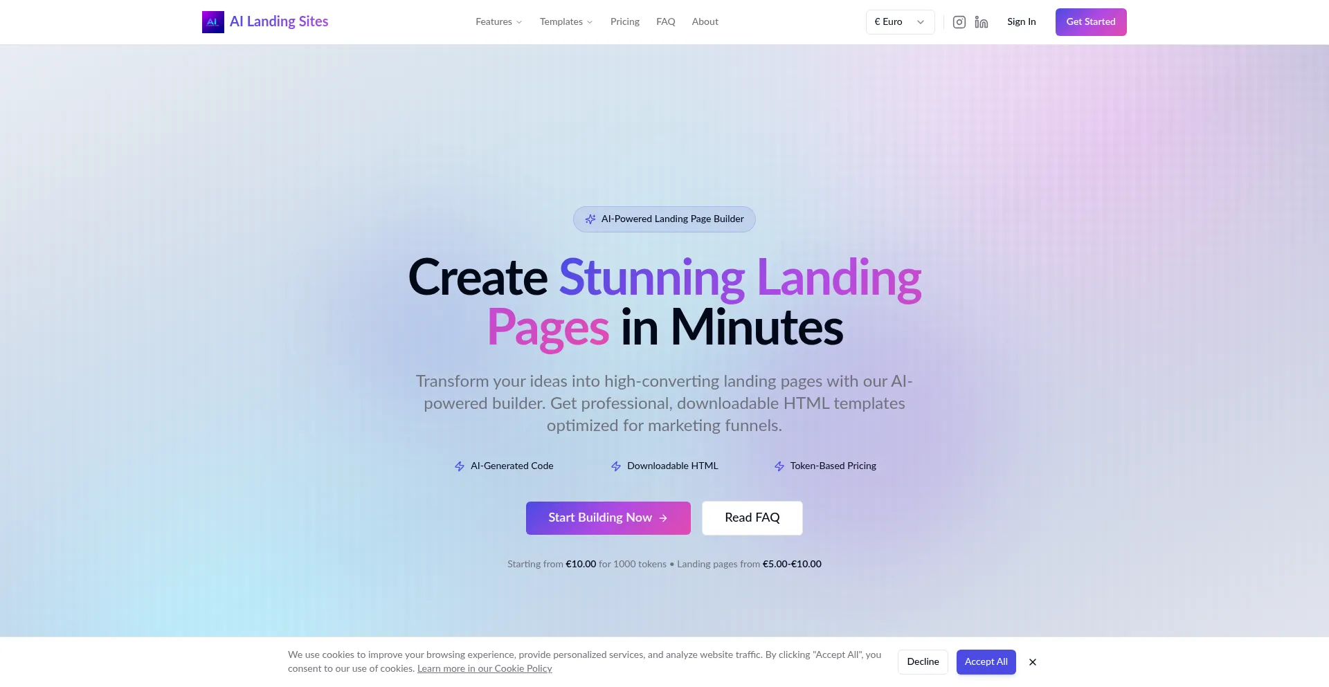 Generate professional, high-converting landing pages instantly with AI. Download ready-to-use HTML files for marketing campaigns. Token-based pricing from €10. Perfect for bus...