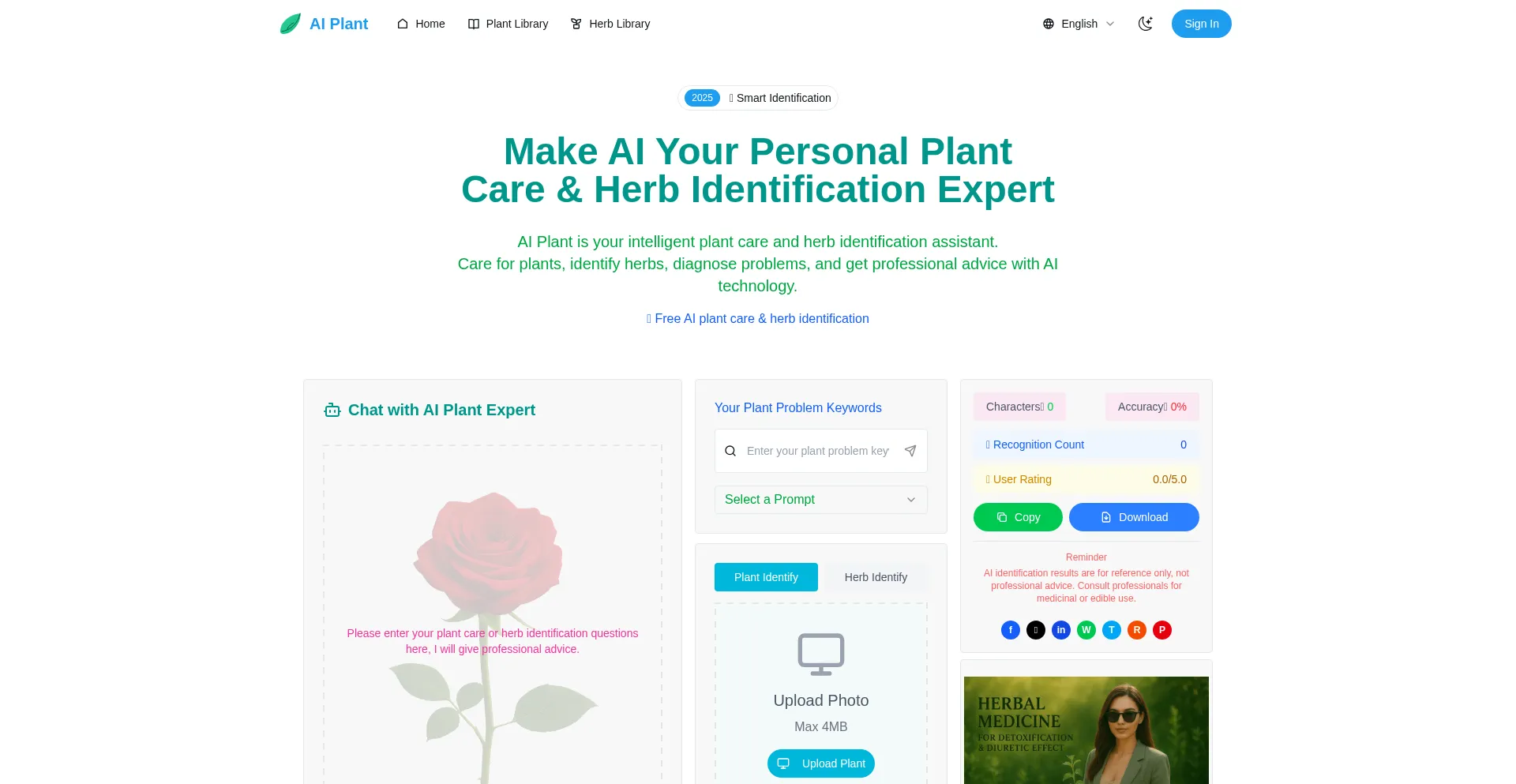 AI Plant identifies plants and herbs, queries medicinal value, usage methods, contraindications. Supports thousands of identifications with professional advice.