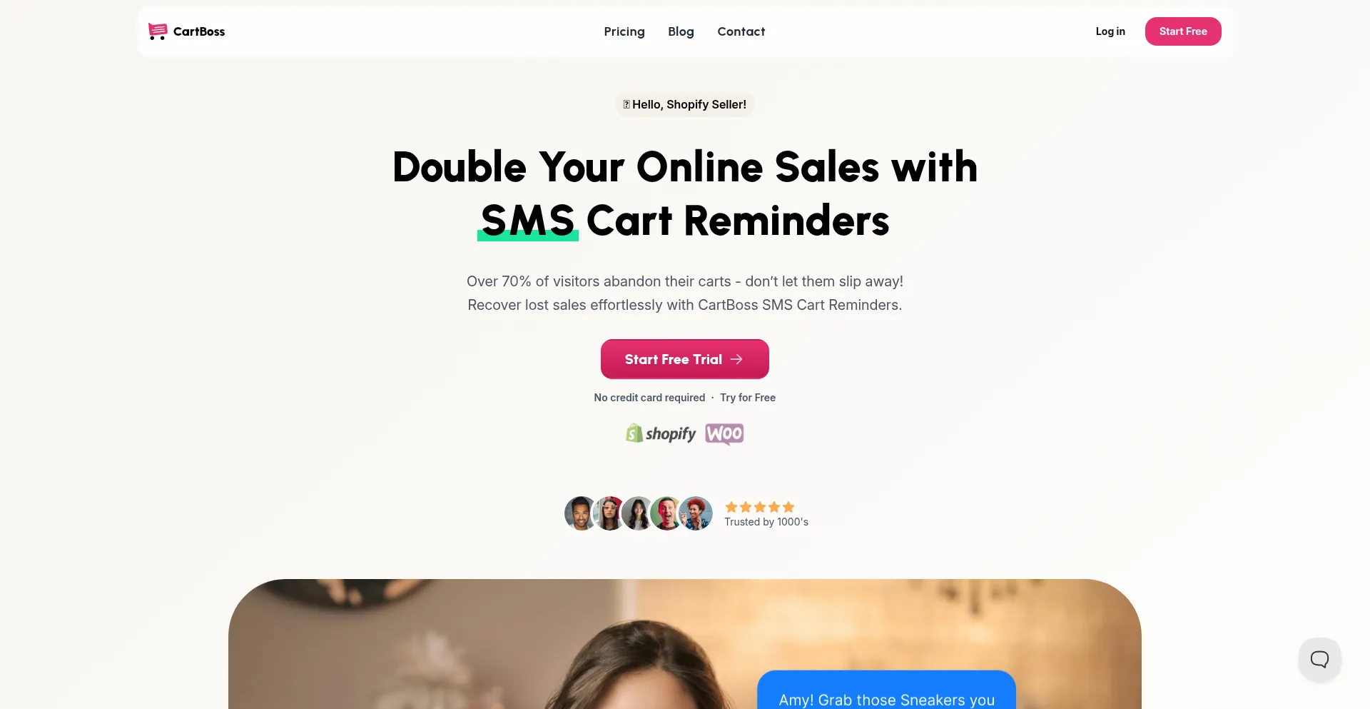 Recover abandoned carts effortlessly with SMS cart reminders. Boost conversions, increase revenue, and improve ROAS using CartBoss's automated SMS campaigns.