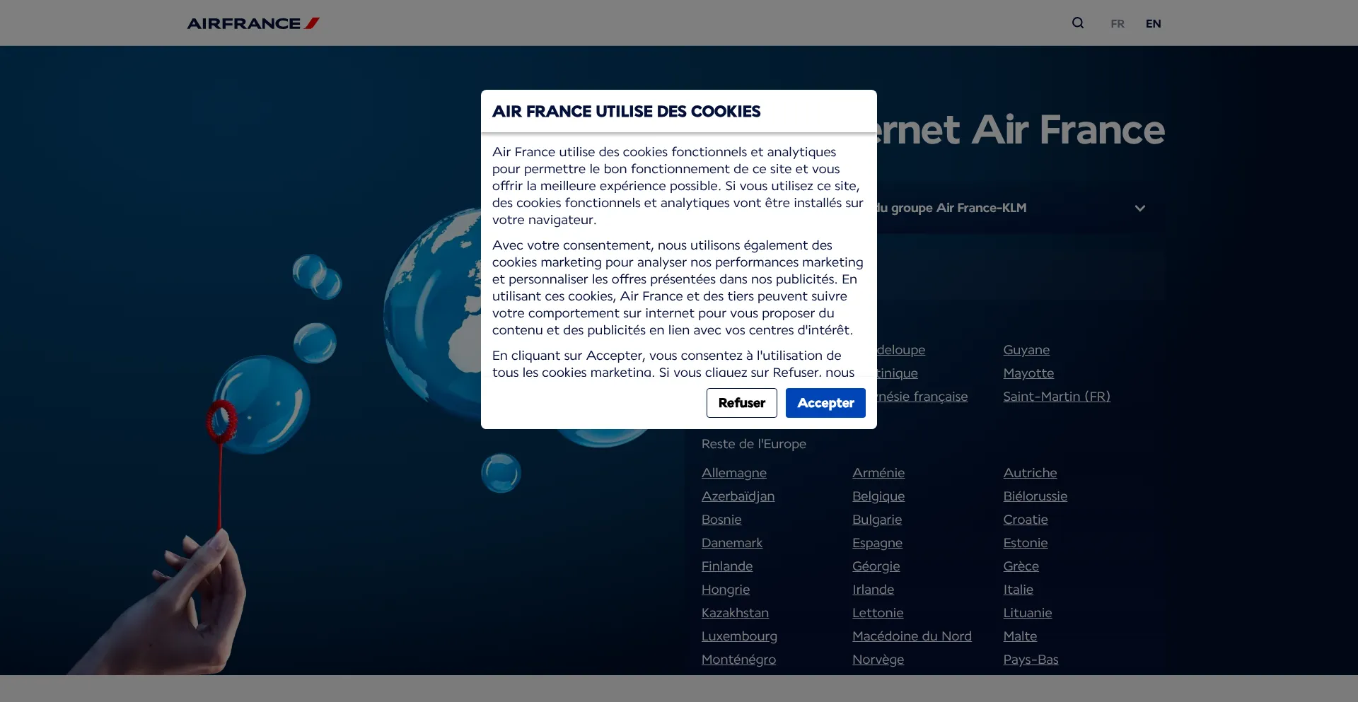Air France utilise des cookies fonctionnels et analytiques pour permettre le bon fonctionnement de ce site et vous offrir la meilleure expérience possible.