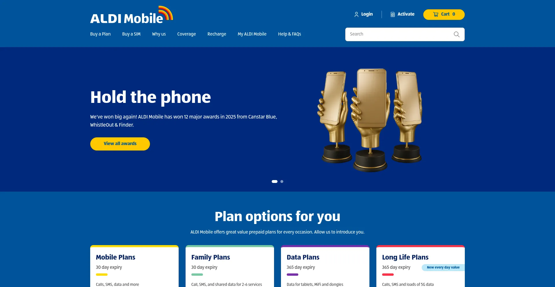 Find SIM and mobile phone plans online with full telco coverage at low ALDI prices. Prepaid, pay as you go, SIM only plans - Browse data rollover and long expiry options now.