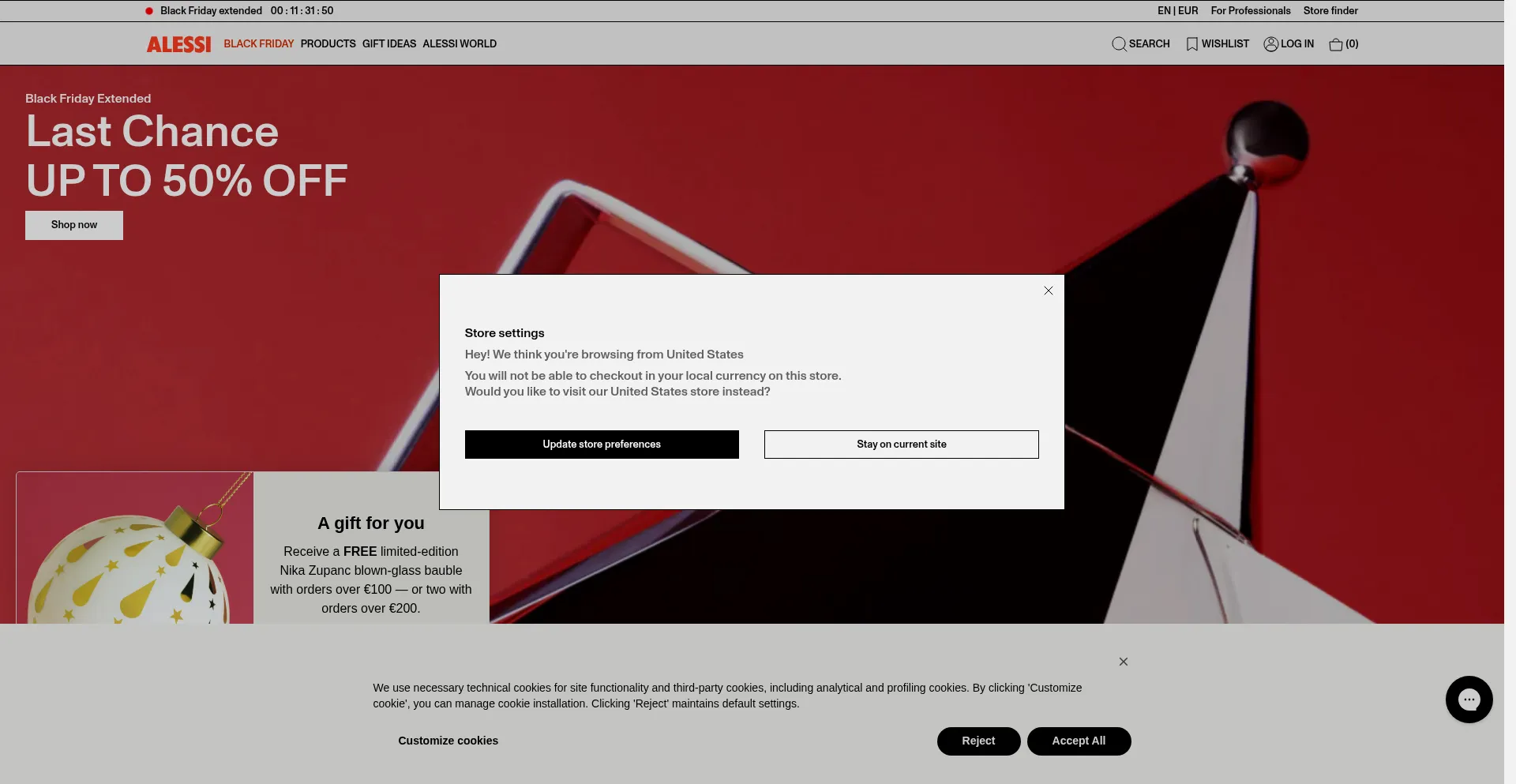 该网站实现符合GDPR或CCPA等隐私法规的cookie同意机制。这表明 alessi.com 遵守数据保护标准并为用户提供对个人数据收集实践的控制。