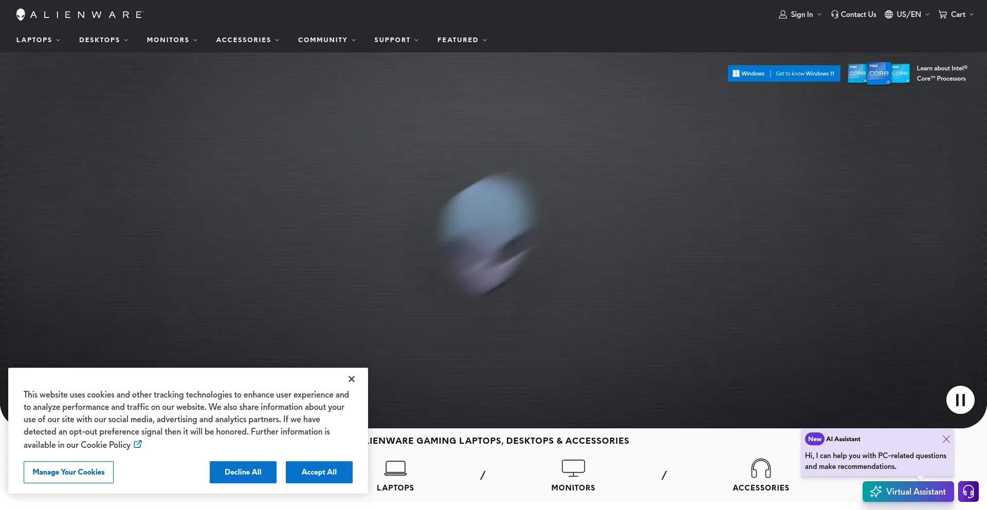 该网站实现符合GDPR或CCPA等隐私法规的cookie同意机制。这表明 alienware.com 遵守数据保护标准并为用户提供对个人数据收集实践的控制。