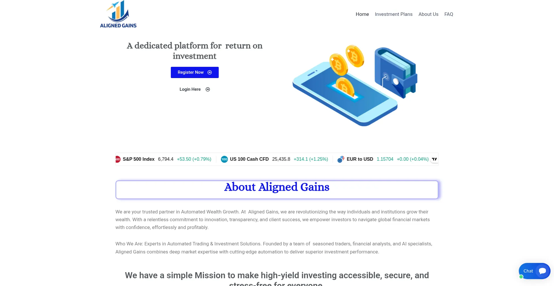 该网站实现数据收集表单,请求个人信息,包括姓名、电子邮件地址、电话号码或其他敏感详细信息。用户应验证 alignedgains.com 的合法性并在提交个人数据前查看隐私政策。
