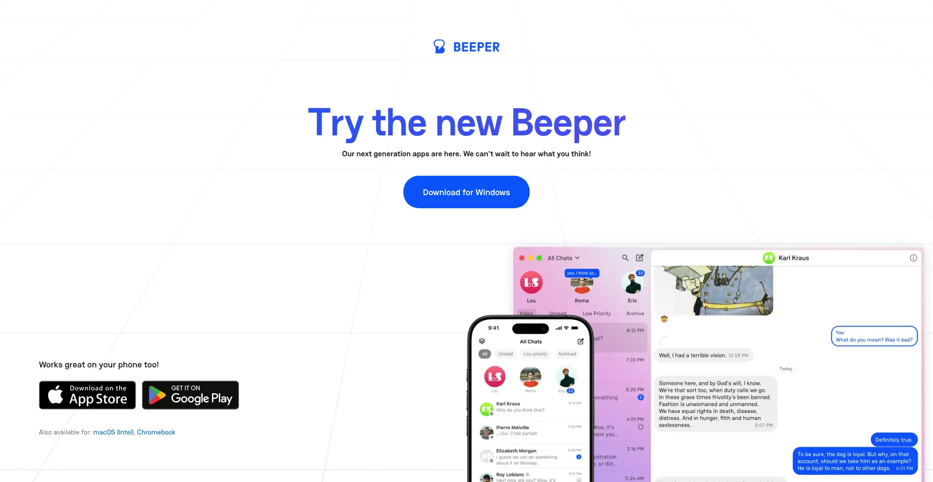 Download Beeper for iOS, Android, Mac, Windows, and Linux. All your chats in one app, including WhatsApp, Signal, Instagram, and more.