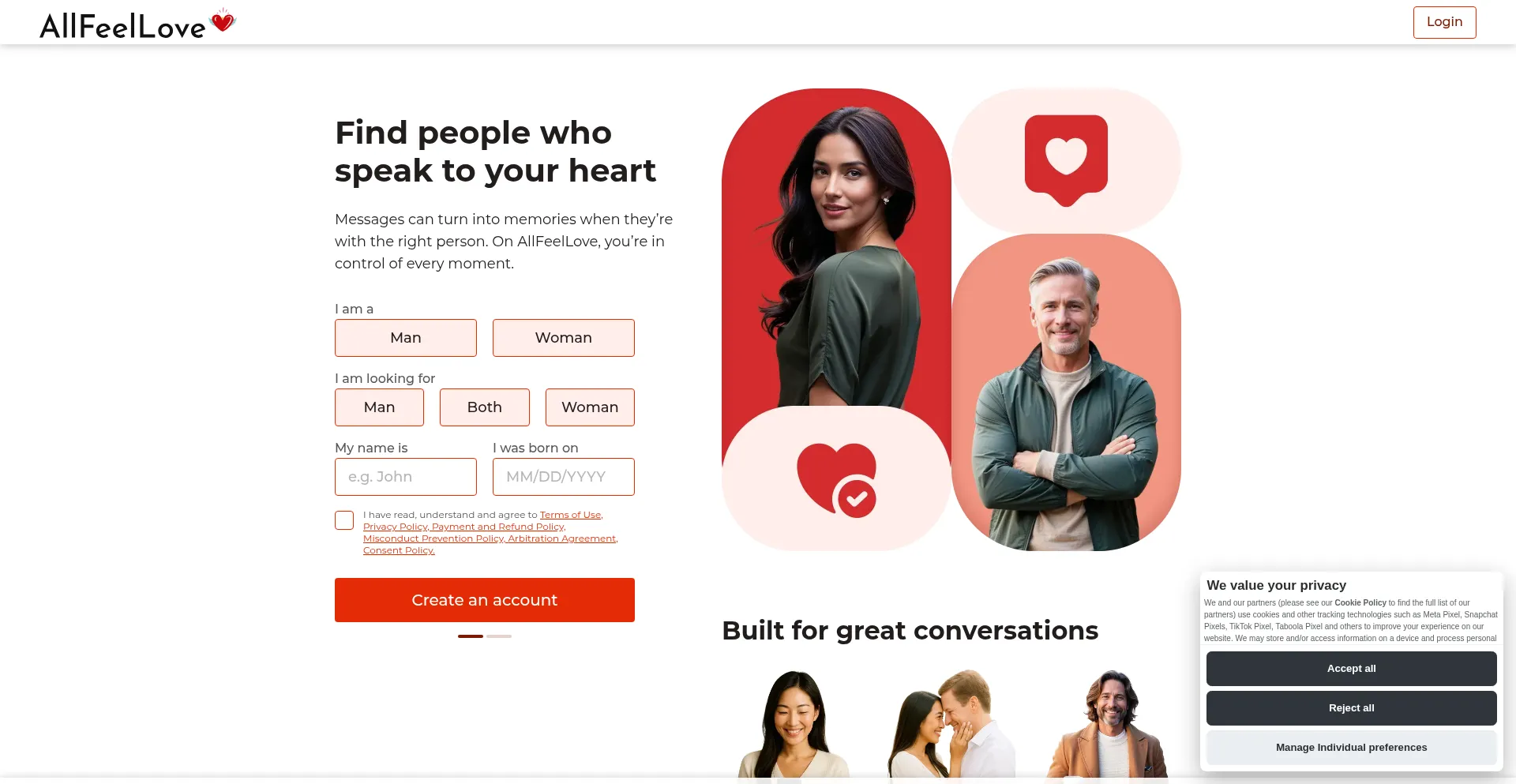 Join AllFeelLove - an online dating space for LGBTQ+ members. Start your journey to meaningful connections in a welcoming environment.