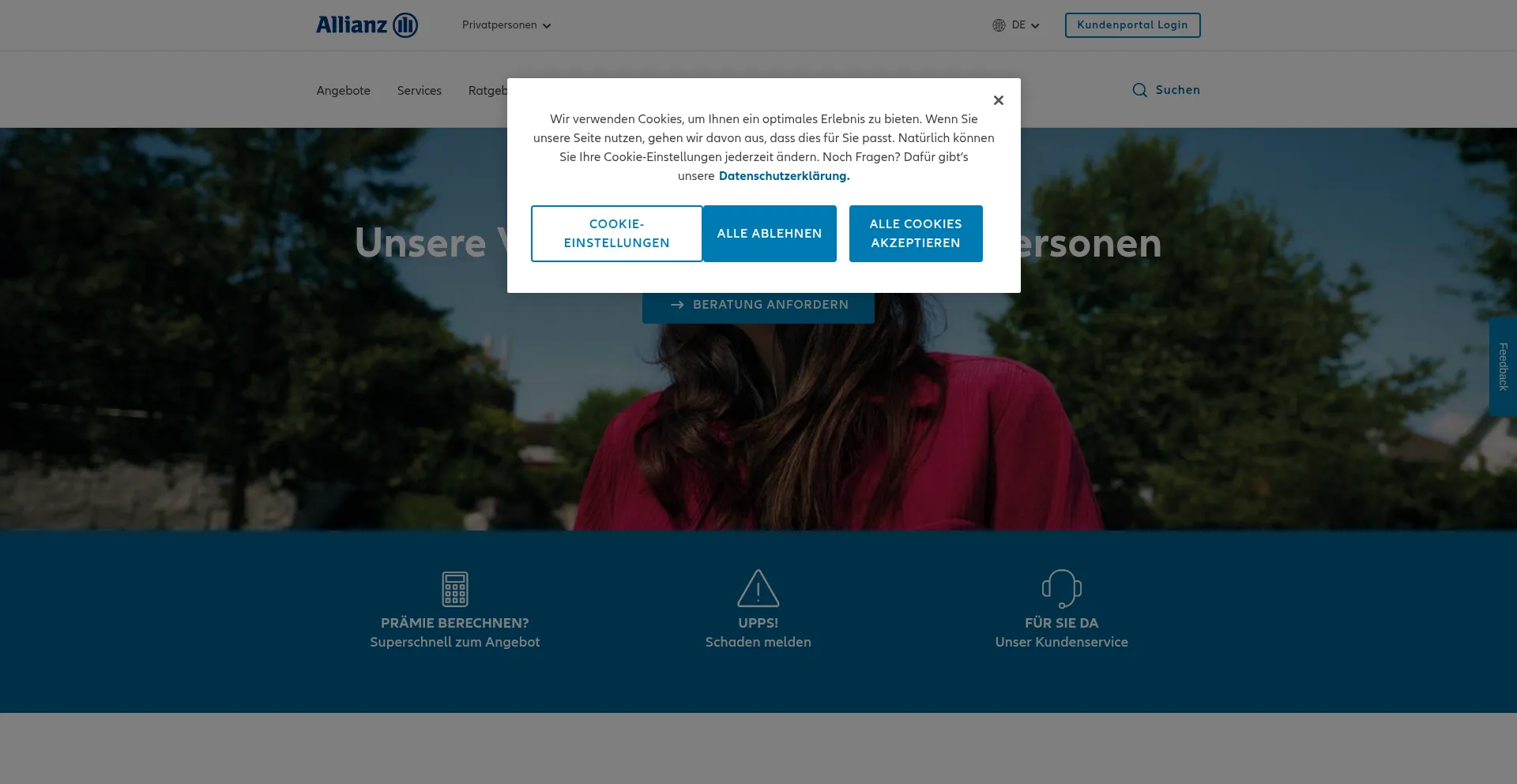 该网站实现符合GDPR或CCPA等隐私法规的cookie同意机制。这表明 allianz.ch 遵守数据保护标准并为用户提供对个人数据收集实践的控制。
