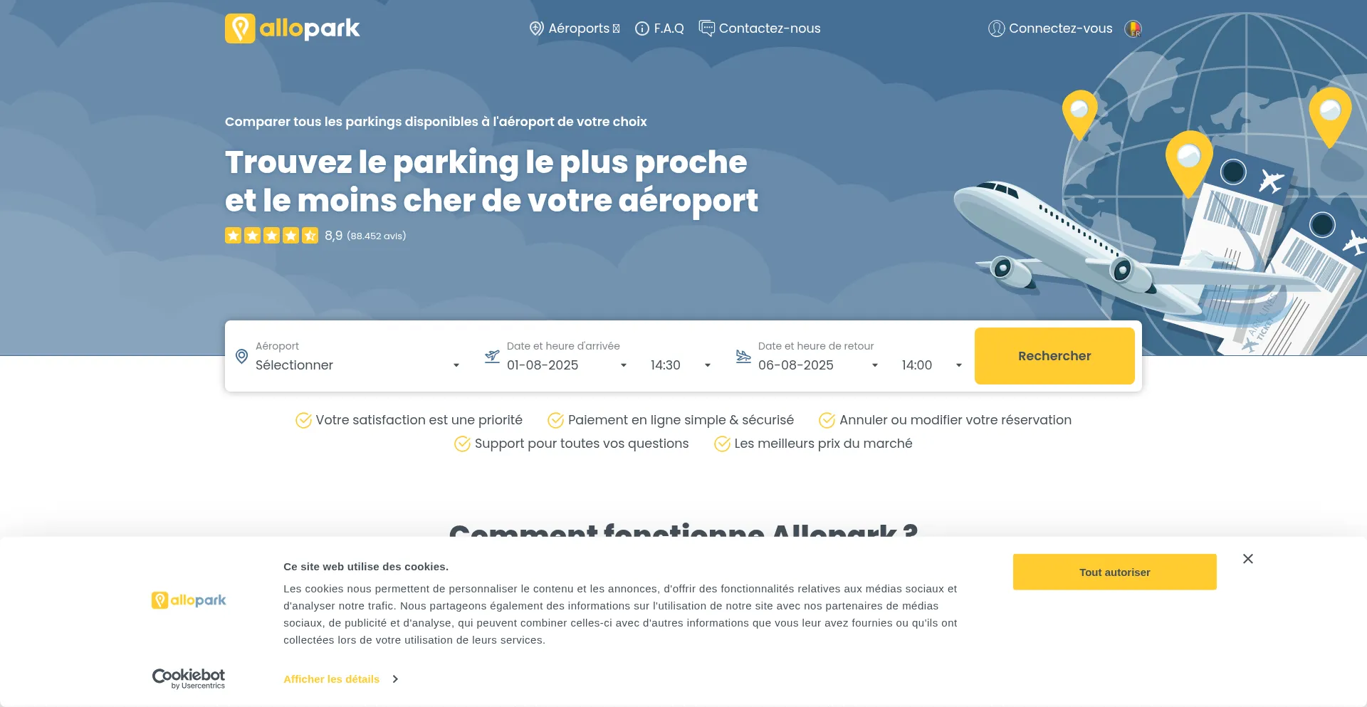 该网站实现符合GDPR或CCPA等隐私法规的cookie同意机制。这表明 allopark.com 遵守数据保护标准并为用户提供对个人数据收集实践的控制。