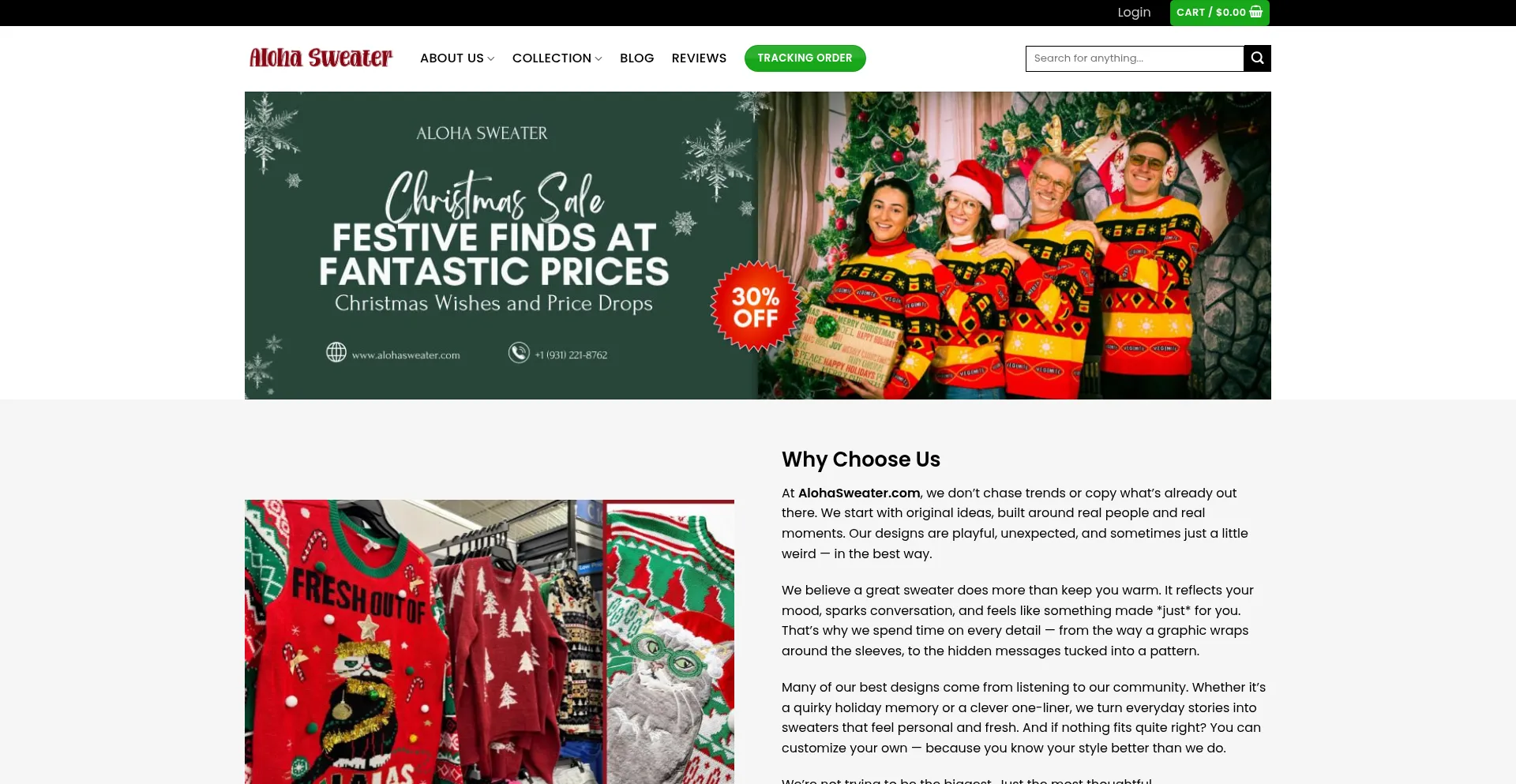 分析表明 alohasweater.com 作为电子商务平台运营,促进商品或服务的在线交易。该网站实现了购物车功能、支付处理系统和产品目录功能,这些是商业零售运营的典型特征。