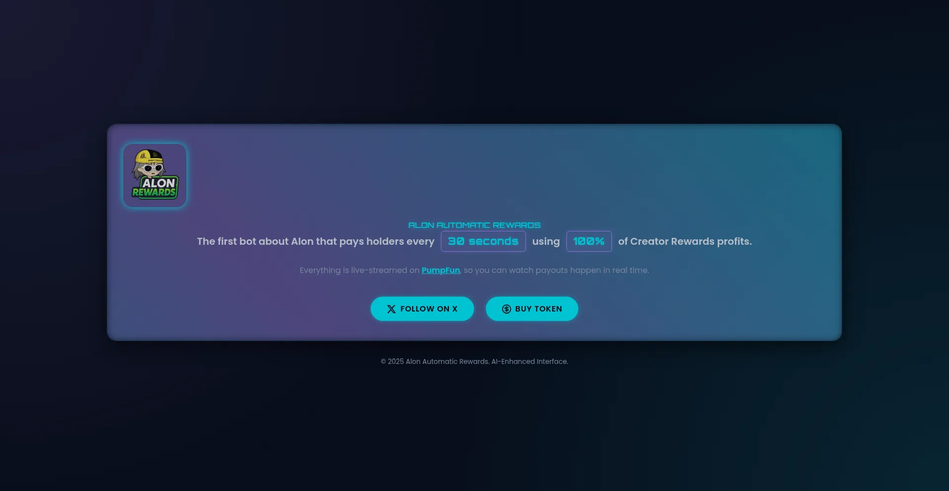 Alon Automatic Rewards - The first bot about Alon that pays holders every 30 seconds using 100% of Creator Rewards profits. Live-streaming on PumpFun.