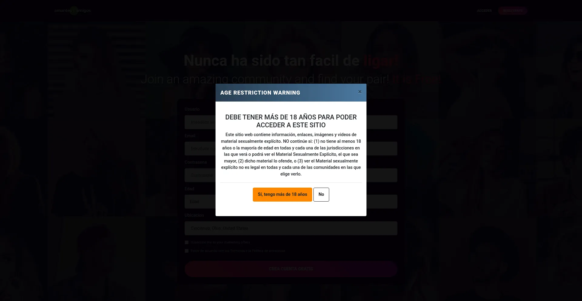 该网站实现数据收集表单,请求个人信息,包括姓名、电子邮件地址、电话号码或其他敏感详细信息。用户应验证 amantesyamigos.com 的合法性并在提交个人数据前查看隐私政策。