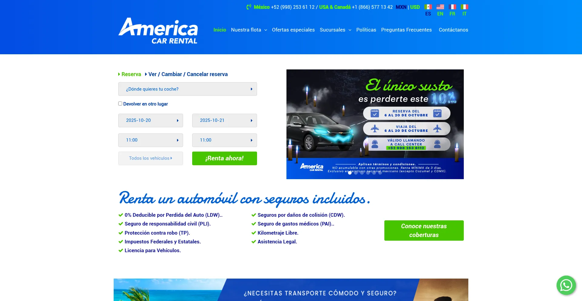 America Car Rental empresa #1 en Renta de Autos en México, ofrecemos Tarifas Económicas con Seguro 0% Deducible Incluido. Servicio los 365 días del año.