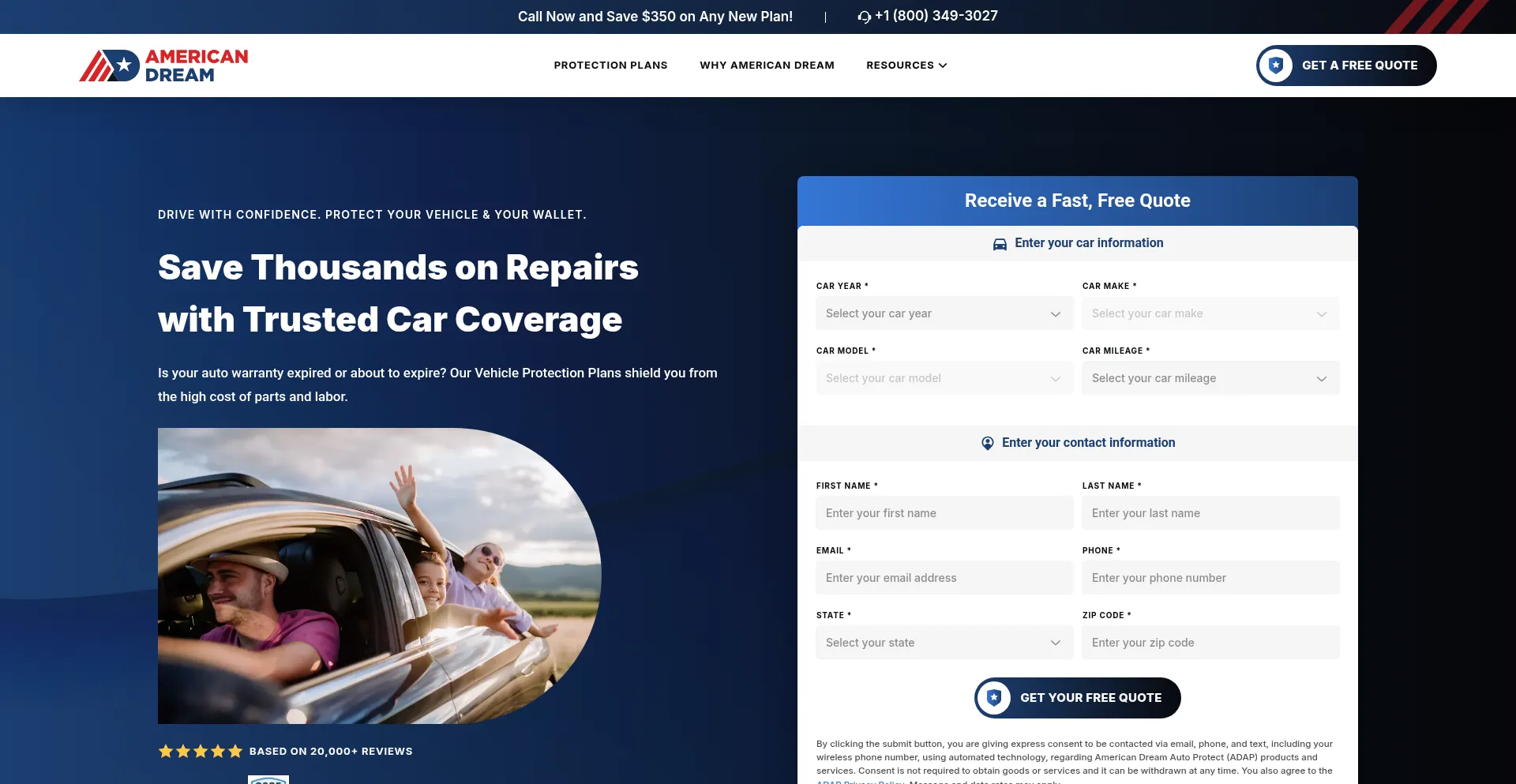 该网站实现数据收集表单,请求个人信息,包括姓名、电子邮件地址、电话号码或其他敏感详细信息。用户应验证 americandreamautoprotect.com 的合法性并在提交个人数据前查看隐私政策。