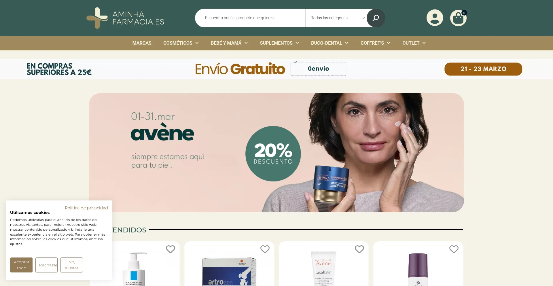 分析表明 aminhafarmacia.es 作为电子商务平台运营,促进商品或服务的在线交易。该网站实现了购物车功能、支付处理系统和产品目录功能,这些是商业零售运营的典型特征。