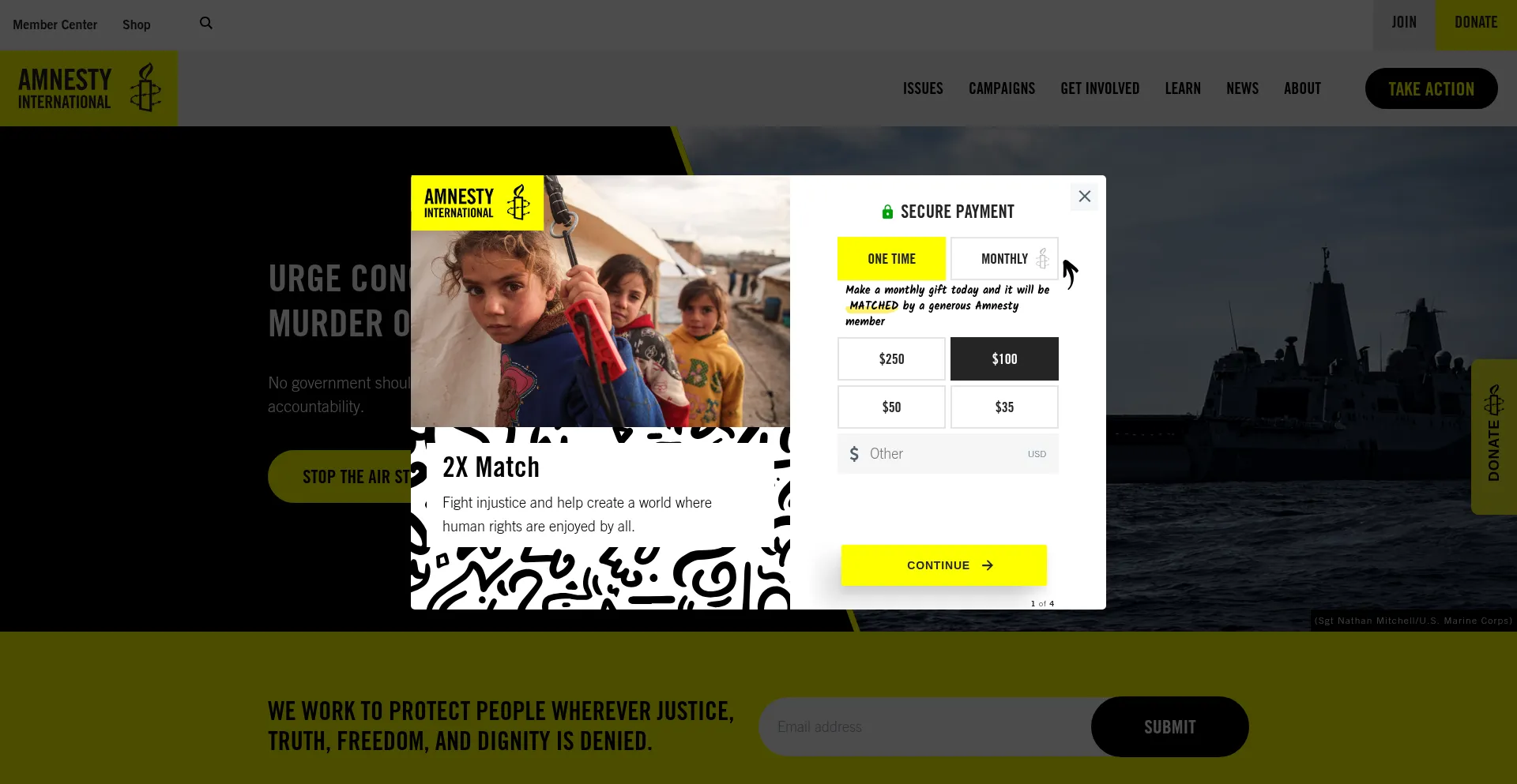 该网站实现数据收集表单,请求个人信息,包括姓名、电子邮件地址、电话号码或其他敏感详细信息。用户应验证 amnestyusa.org 的合法性并在提交个人数据前查看隐私政策。