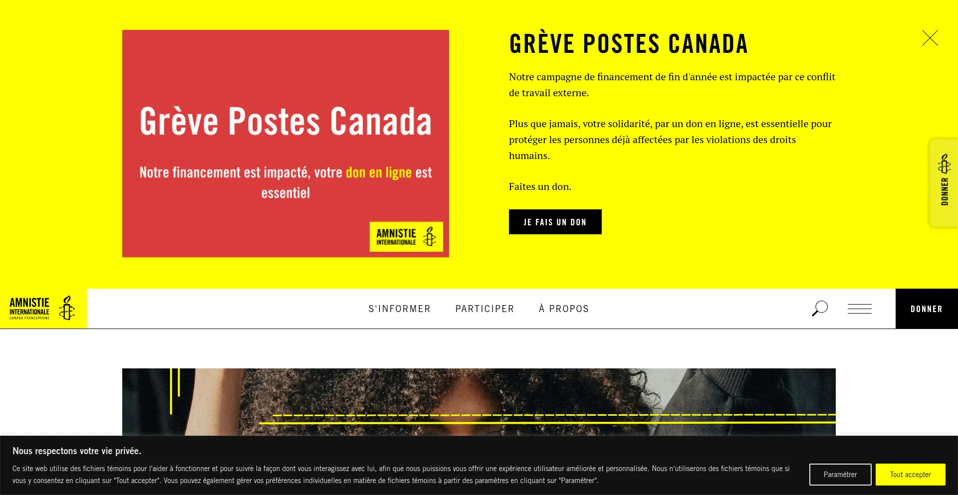 该网站实现符合GDPR或CCPA等隐私法规的cookie同意机制。这表明 amnistie.ca 遵守数据保护标准并为用户提供对个人数据收集实践的控制。