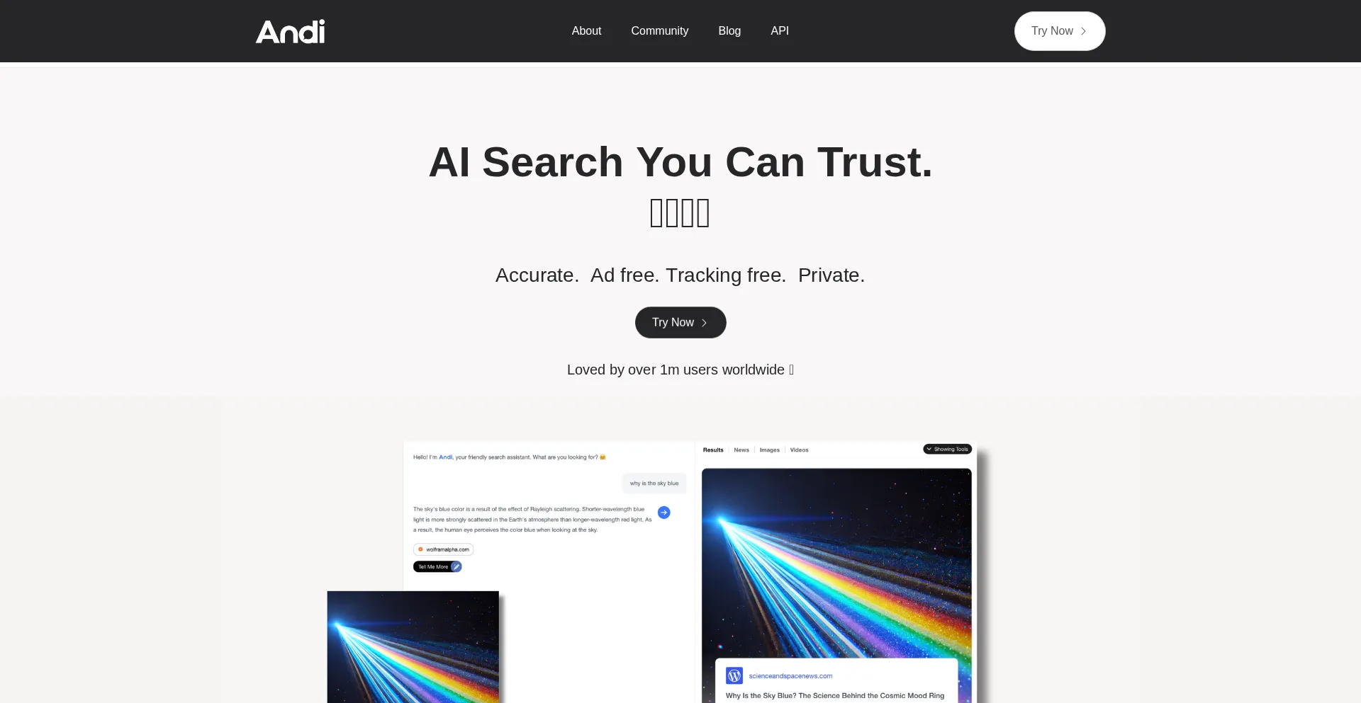 Andi is Your Smart AI Search Assistant. Learn how Andi can help you get fast accurate answers with no ads or tracking. See about, community, privacy and more.