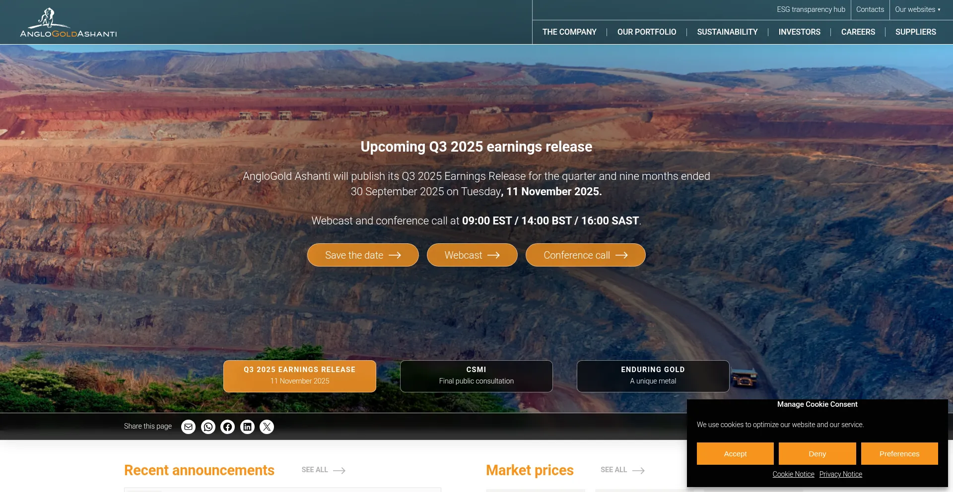 该网站实现符合GDPR或CCPA等隐私法规的cookie同意机制。这表明 anglogoldashanti.com 遵守数据保护标准并为用户提供对个人数据收集实践的控制。
