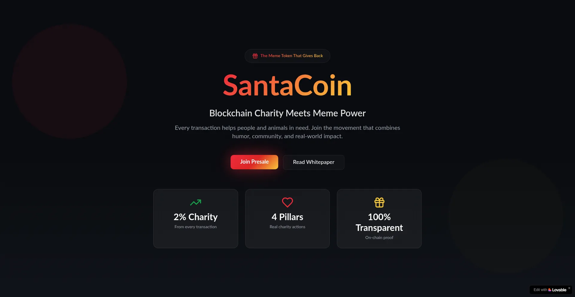 Join SantaCoin, the first feel-good memecoin. Every transaction helps people and animals in need. Transparent charity, real impact, 100% on-chain.