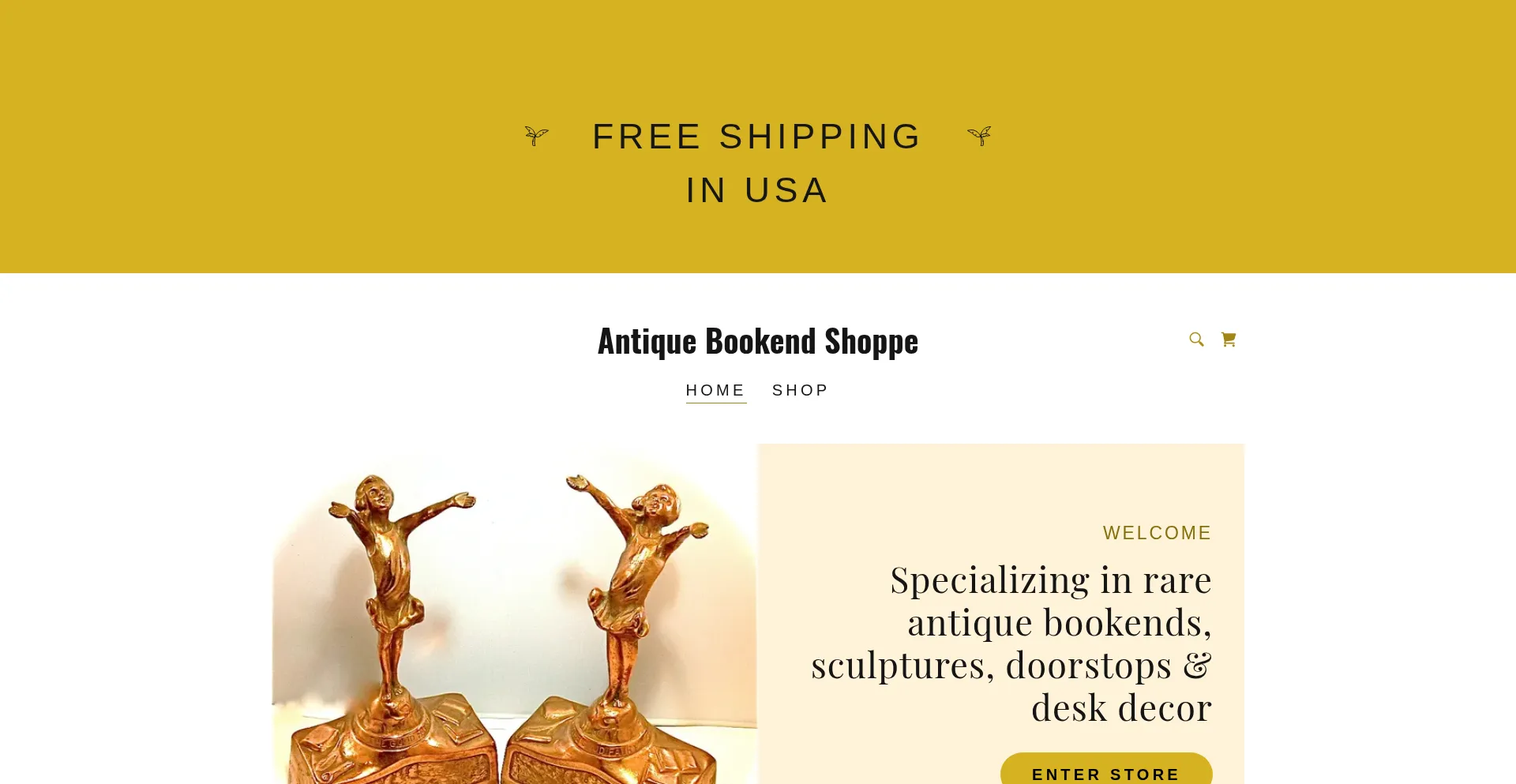 Antique Bookend Shoppe specializing in high quality, rare antique bookends, bronzes, sculptures, doorstops, desk & dresser dish/trays and other metal arts.