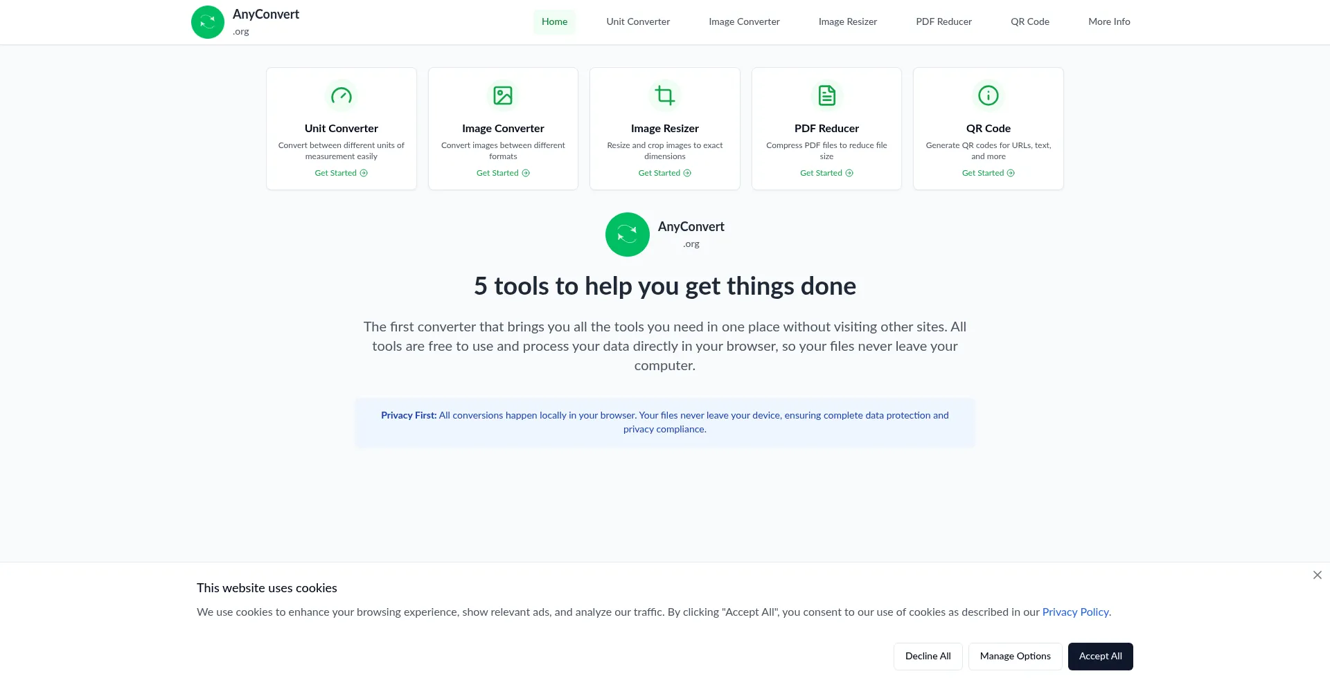 该网站实现符合GDPR或CCPA等隐私法规的cookie同意机制。这表明 anyconvert.org 遵守数据保护标准并为用户提供对个人数据收集实践的控制。