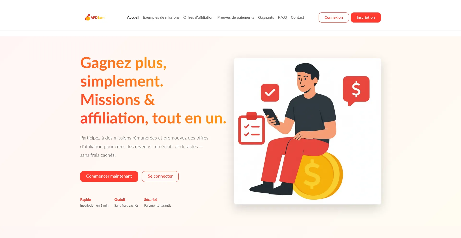 APDEarn - Plateforme d'affiliation hybride qui permet de gagner de l'argent en ligne en réalisant des missions et en promouvant des offres d'affiliation rentables.