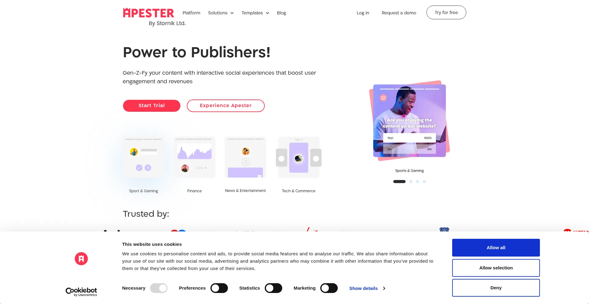 该网站实现符合GDPR或CCPA等隐私法规的cookie同意机制。这表明 apester.com 遵守数据保护标准并为用户提供对个人数据收集实践的控制。